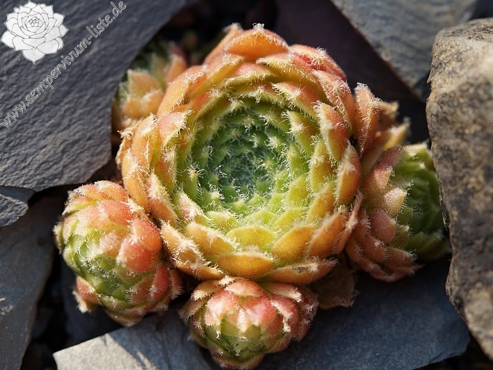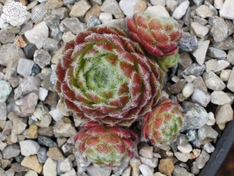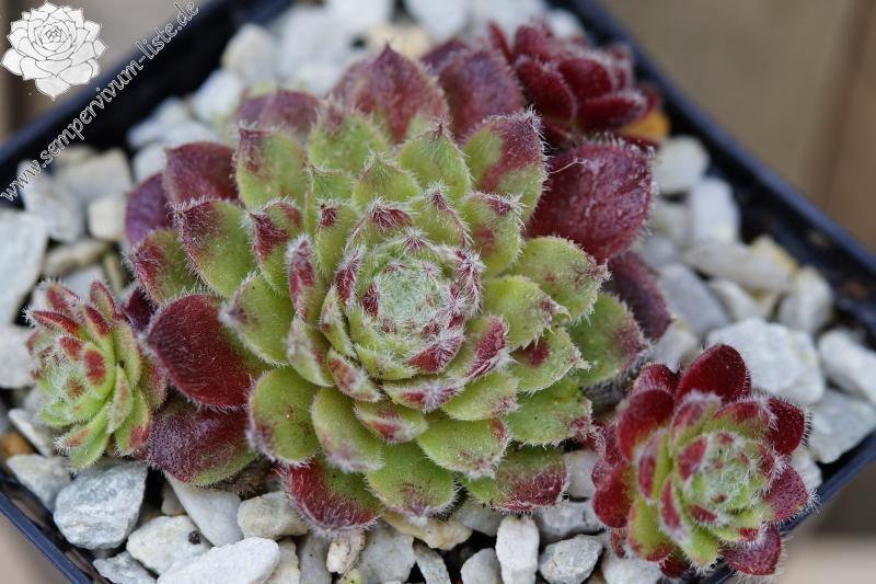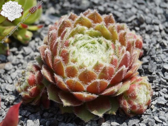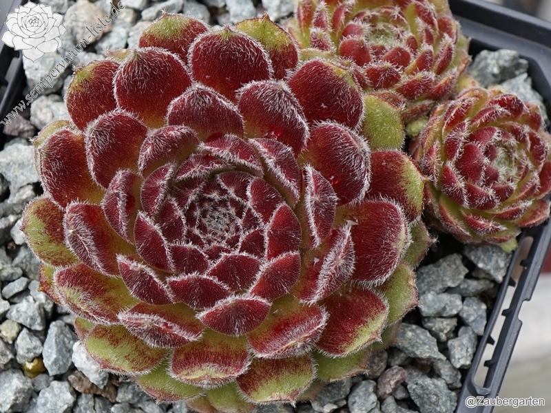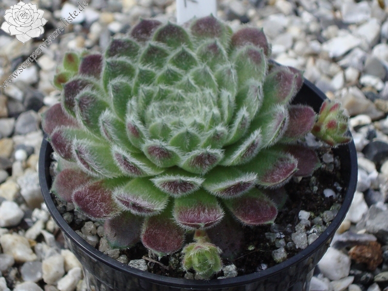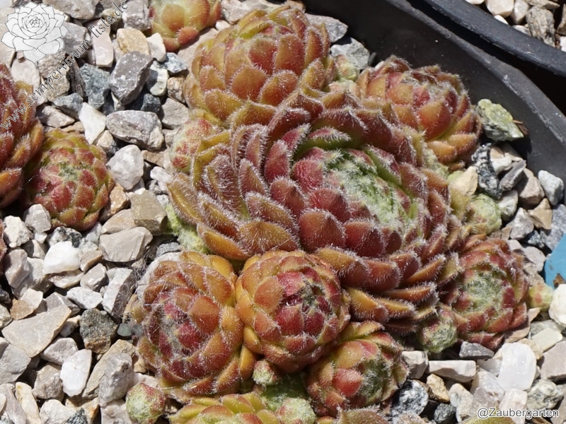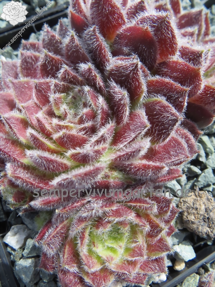Sempervivum 'Gwenfyl' ist eine kleinere Sorte, die schön behaart ist. Sie besitzt rötliche Blattenden und sprosst willig.