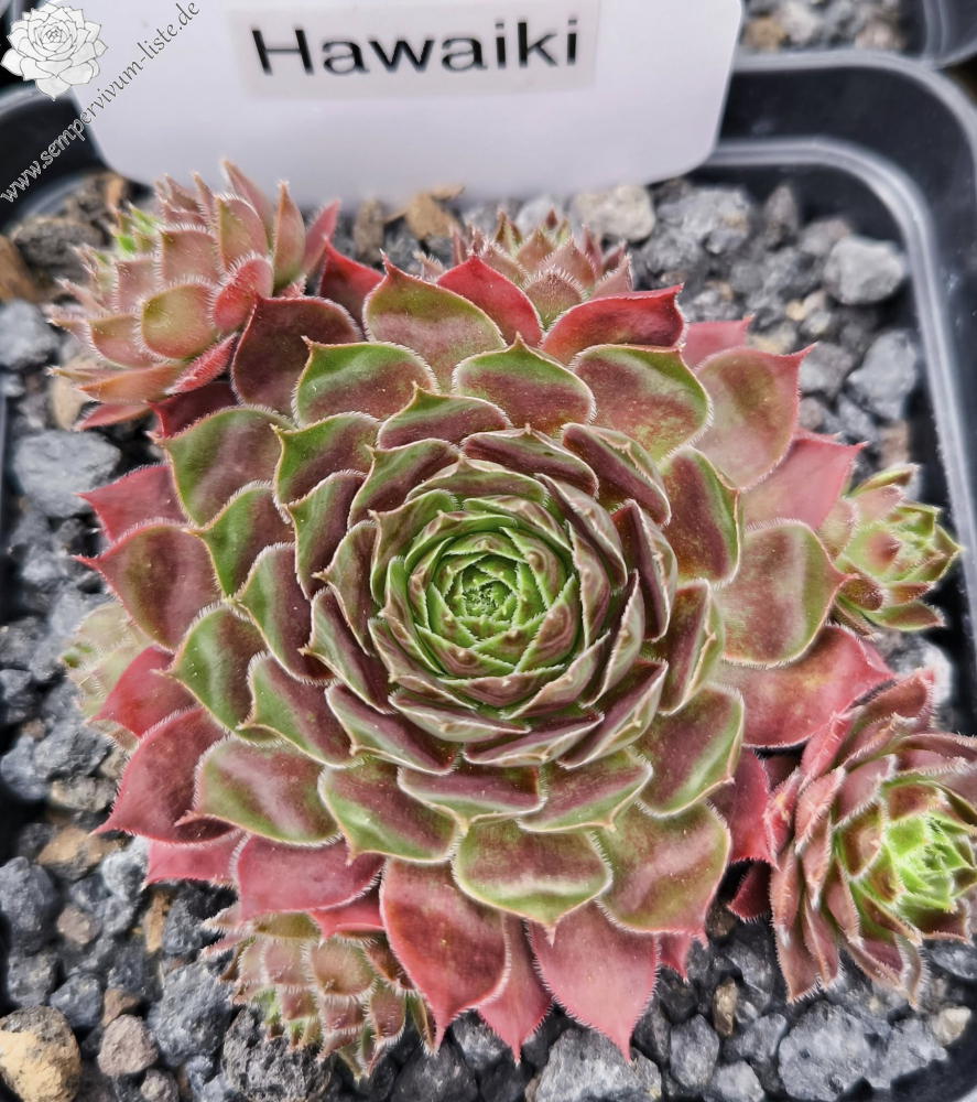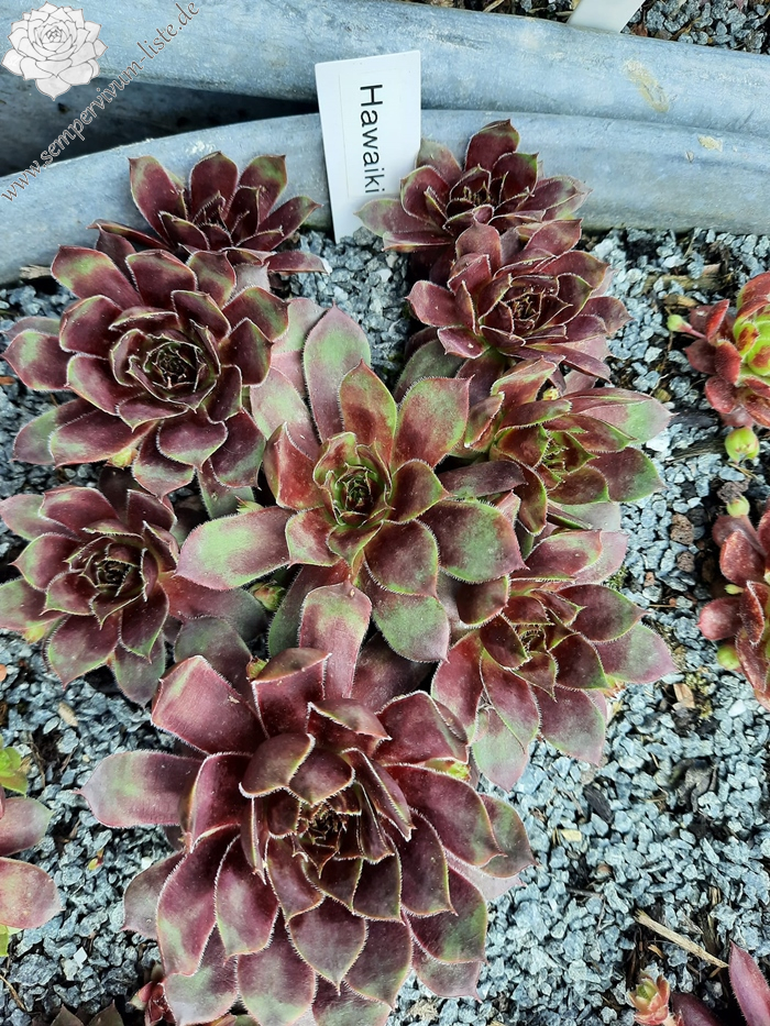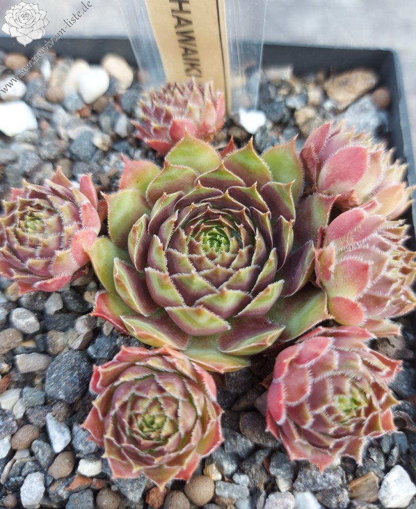 Sempervivum Hawaiki ist eine neue deutsche Züchtung, die mir gut gefällt. Die mittelgroßen Rosetten besitzen eine interessante Färbung und haben sich als sehr robust gezeigt. Besonders schön finde ich die Rosetten im Mai. Es handelt sich um eine Kreuzung von Sempervivum Burnt Embers x Goldmarie.