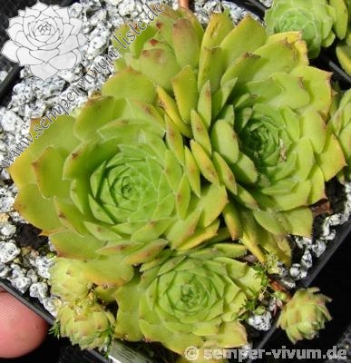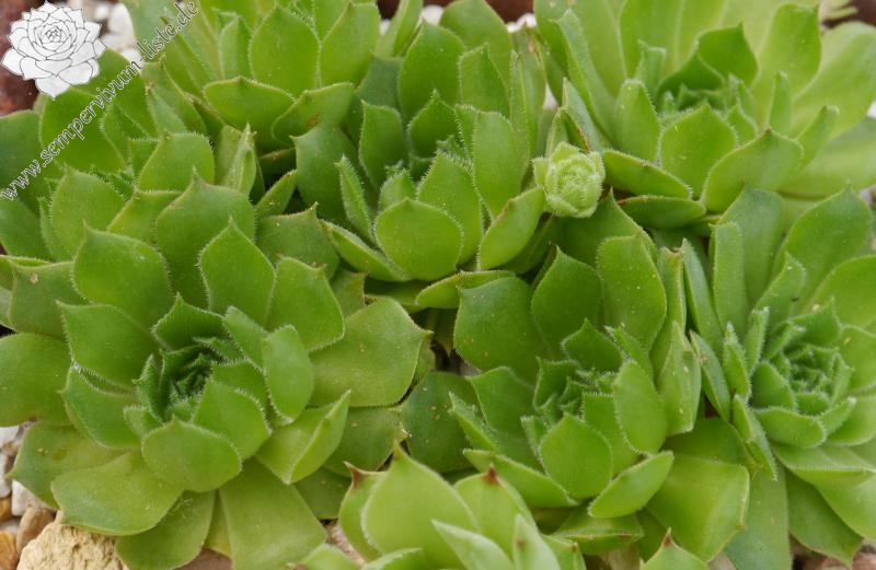 Erwin Geiger: Eine Naturhybride aus S. grandiflorum x S. tectorum mit frischgrünen, fein behaarten Rosetten, die im Aostatal in Italien gefunden wurde. Im Sommer verfärben sich die Blätter bei vollsonnigem Standort gelblichgrün.