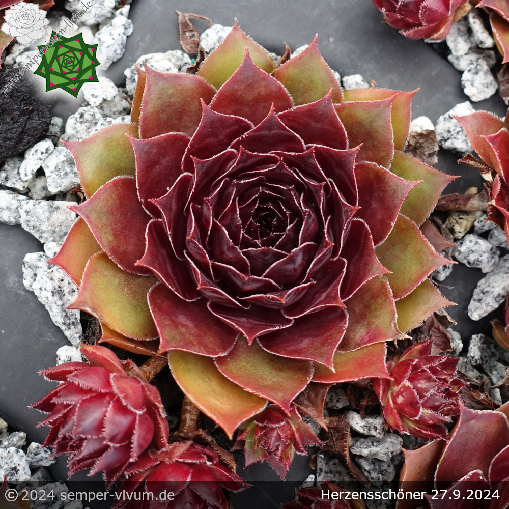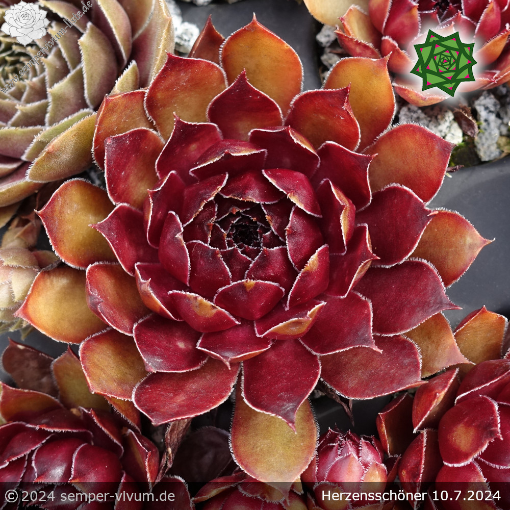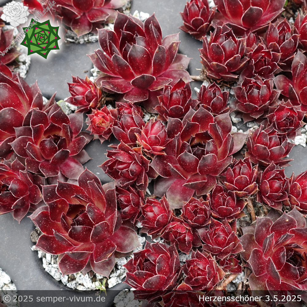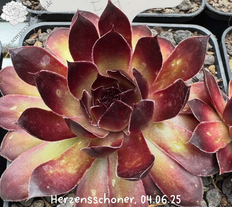 Es ist ein Sämling und zugleich eine Verbesserung der belgischen Sorte 'Aalrika': Die Rosetten haben große Ähnlichkeit in Form und Farbe. Insgesamt ist unsere Neuheit jedoch wüchsiger, da die Muttersorte jedes Jahr recht wenig Nachwuchs formt. Allgemein verlieren viele rote Hauswurz Züchtungen während der heißen Monate ihre brillanten Rottöne. Davon ist 'Herzensschöner' ausgenommen, da sie auch zu dieser Jahreszeit durch die leuchtend rote Färbung ins Auge fällt.2025: Es ist ein Sämling der sehr gesuchten belgischen Rarität 'Aalrika', die kaum Nachwuchs hat. Die Rosetten haben große Ähnlichkeit in deren Größe, Form und Farbe. Erfreulicherweise ist unsere neue Auslese wüchsiger. Daher könnte man sie schon als eine Verbesserung der Muttersorte beschreiben. Allgemein verlieren viele rote Hauswurz Züchtungen während der heißen Monate ihre brillanten Rottöne. Jedoch fällt 'Herzensschöner' auch zu dieser Jahreszeit durch die leuchtend rote Färbung ins Auge, währenddessen sogar noch bronzefarbene Töne den Glamour verzaubern.