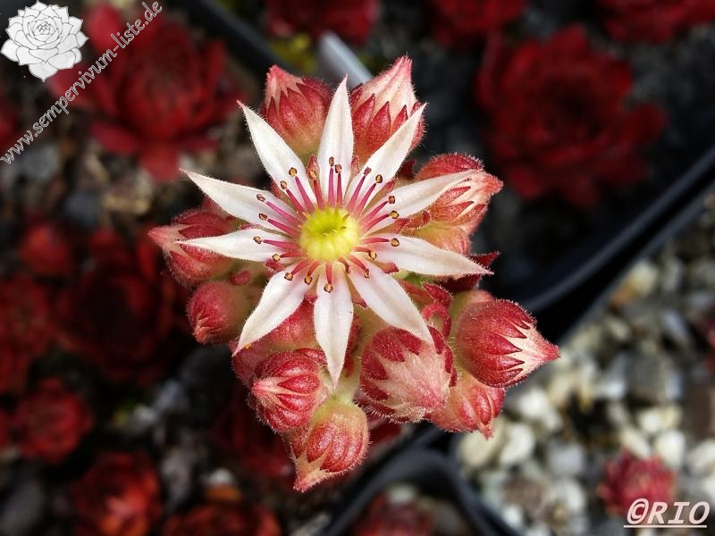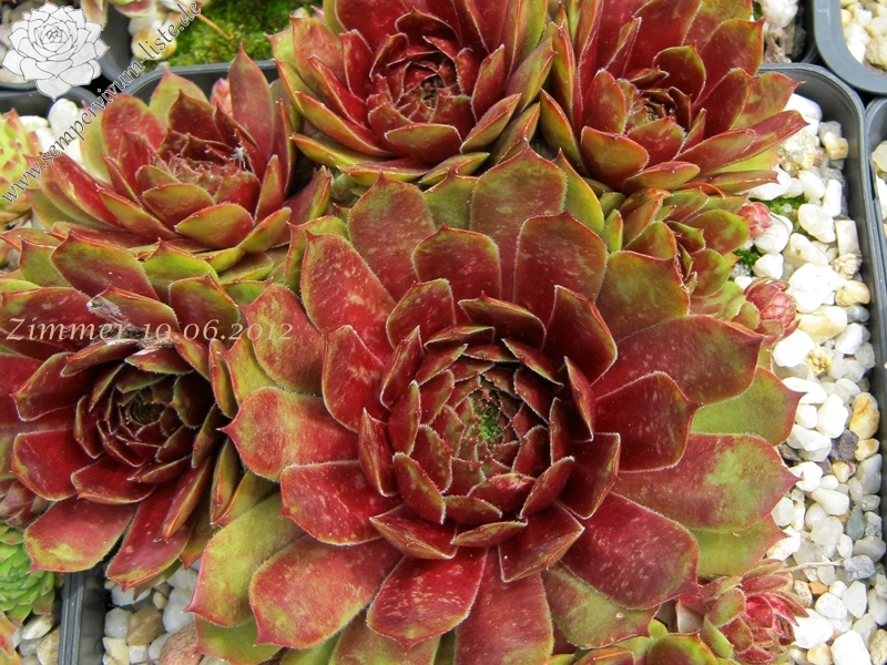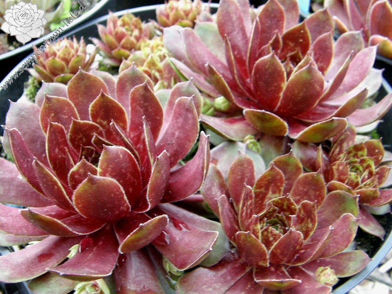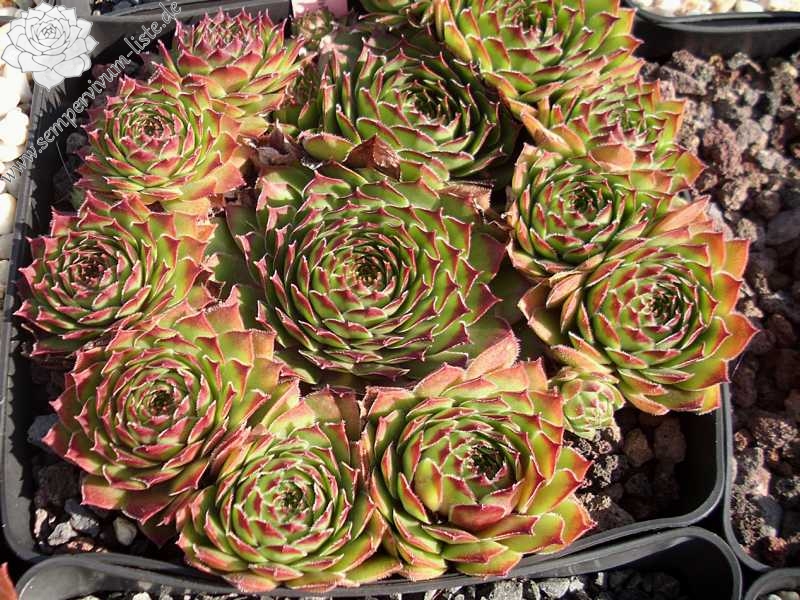 Ein Nachkomme aus einer Kreuzung eigener Hauswurz-Sämlinge, die wegen ihrer weißgelben Blütenfarbe ausgewählt und vermehrt wurden. Die Rosetten können einen Durchmesser von 9 cm erreichen und sind gut wüchsig. Im Frühjahr fällt die Pflanze durch das kräftig rote Zentrum mit wässrig grün-roten Blattenden auf. Das Besondere jedoch ist die warme Sommerfärbung, die auf dem Foto zu sehen ist und die sehr lange anhält. Sie erinnerte mich an frischen Blütenhonig der aus den Waben fließt. Die perfekte runde Form, mit dem leuchtend warmen Farben, scheinen wie ein Mond und so ergab sich der Name ‚Honigmond’. Ein sehr gesunder und wüchsiger Sempervivum. Leider nur wenige Rosetten!