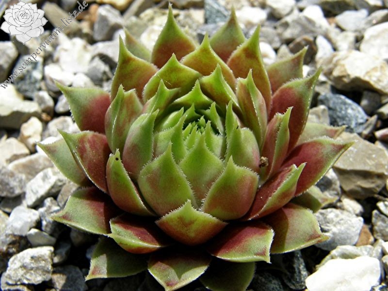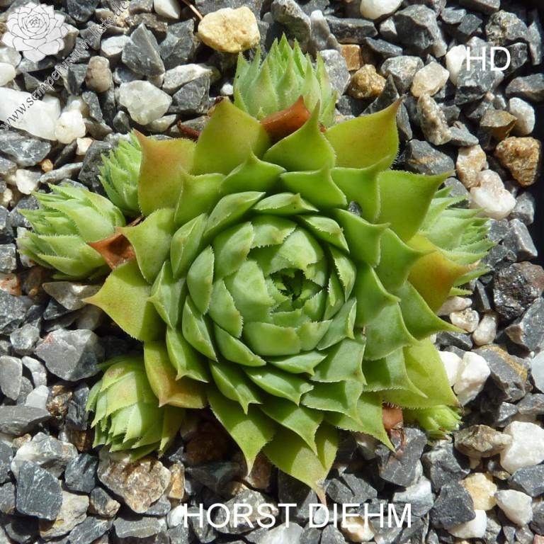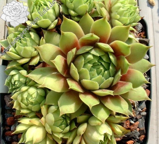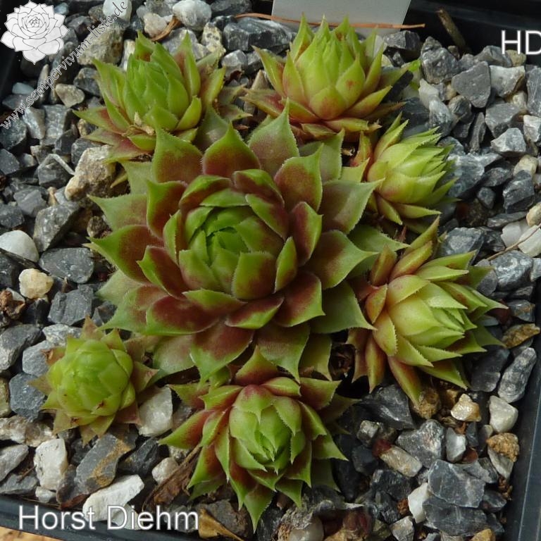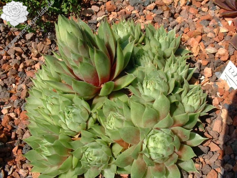hellgrüne bis 6 cm große Rosetten, im Frühjahr innen an der Basis rot, behält im Winter die helle Farbe, Zufallssämling