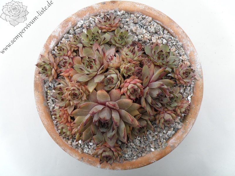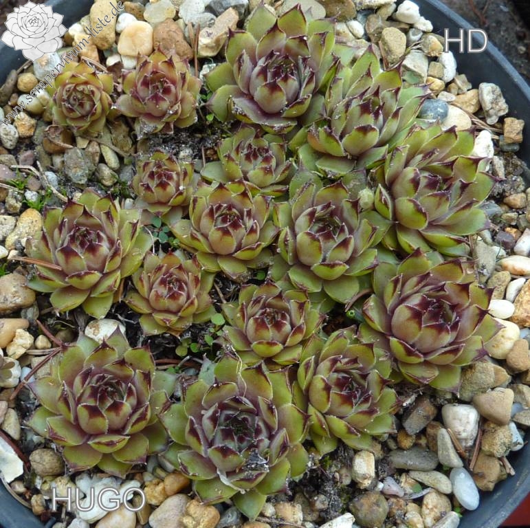 Einer unserer ersten Sämlinge mit mittelgroßen Rosetten in bräunlichem Oliv. Die Blattspitzen hingegen in kontrastfarbenem, dunklem Mahagonibraun. 'Hugo' erinnert im Sommer an eine französische S. calcareum in hellem Bronzeton.