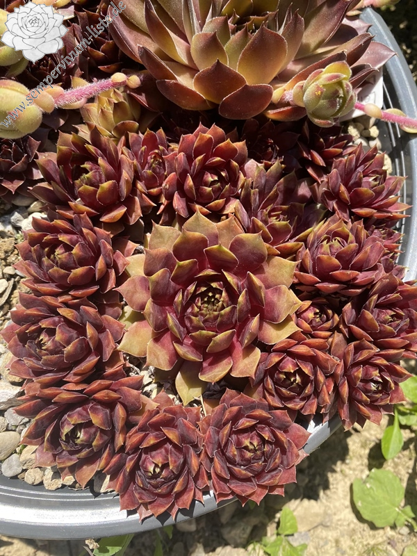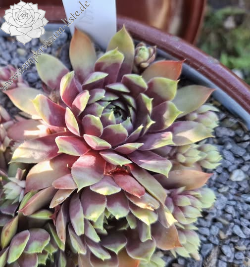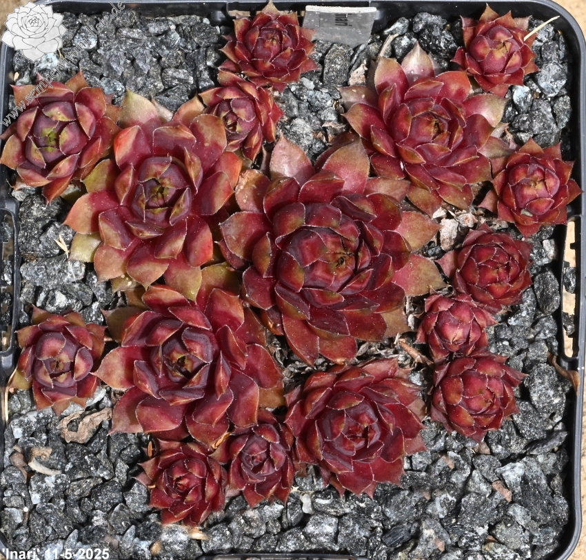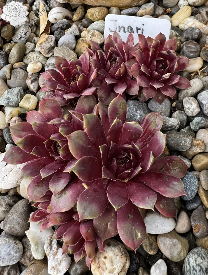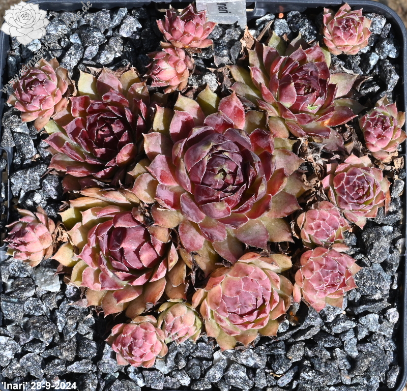 'Inari' bildet größere Rosetten, gute 10 cm, mit länglichen fein bewimperten Blättern, die im oberen Teil eine leichte bläuliche Marmorierung zeigen. Im Frühjahr sind die Rosetten in dunklerem Rot gefärbt, die äußeren Blätter sind im äußeren Drittel beigefarben und tragen spitze Dornen. Im Juni werden die Blätter heller mit einer rosa Mischfarbe. Im Sommer sind die äußeren Blattreihen strahlend pink, mit etwas beige aufgehellt. Zur kompakteren und knospigen Mitte hin geht die Farbe in Magenta über und wird immer dunkler. Gerade in der Sommerhitze hält sie diese Farben gut. Die inneren Spitzen sitzen auf einer kleinen hellgrün marmorierten Welle. Manche ihrer Dornen sind nach außen gebogen. Im Gegensatz zur Mutterpflanze ist sie gut wüchsig und bildet genug Nachwuchs. Mit dem Blühen hält sie sich bis jetzt zurück und hat selbst im 4. Jahr noch nicht geblüht. 'Inari' ist eine robuste und unempfindliche Pflanze.