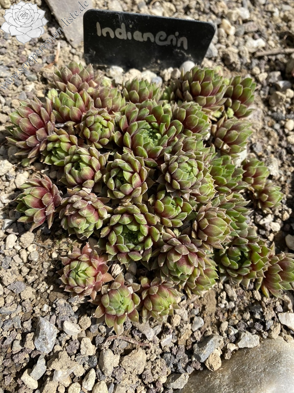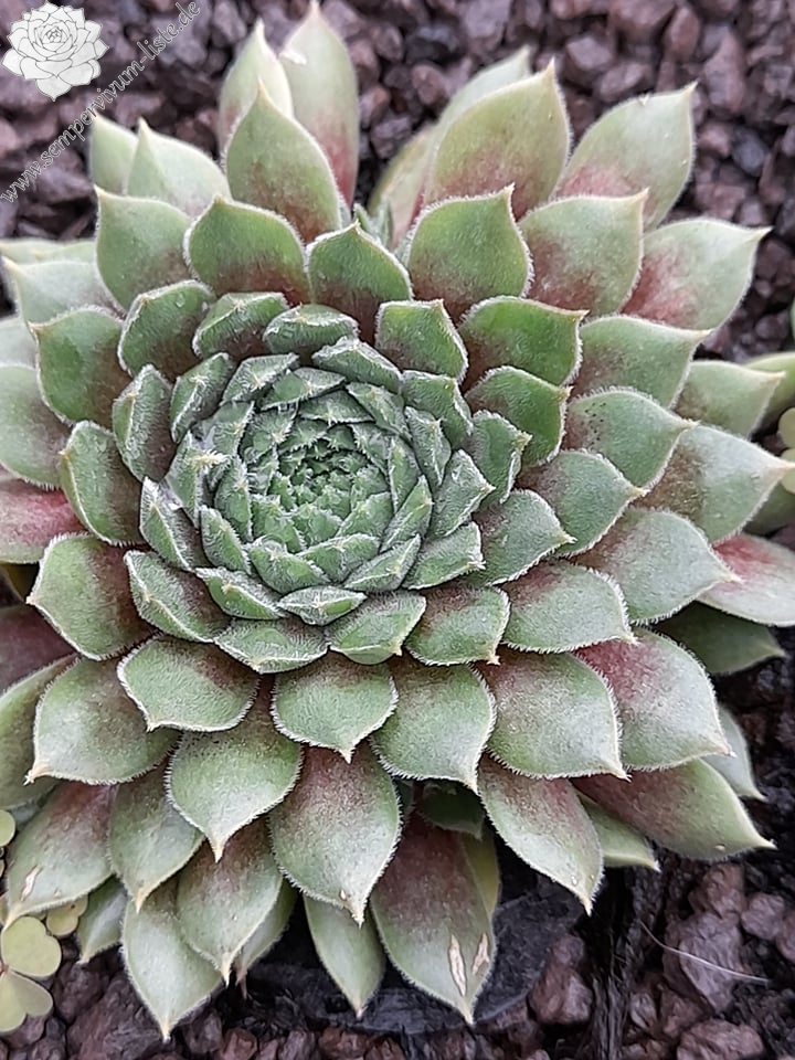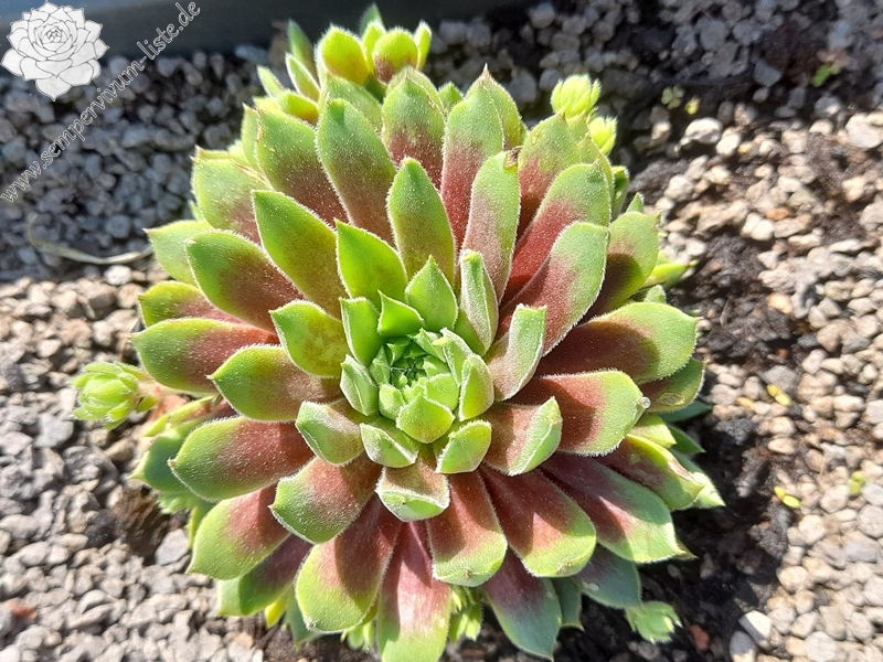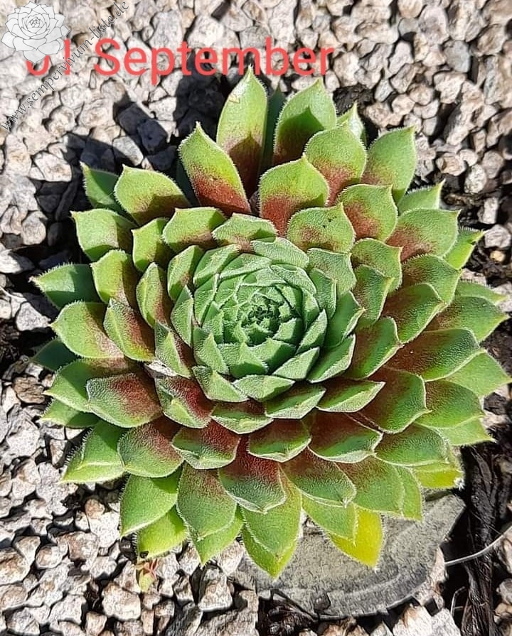 Die Rosetten haben einen Durchmesser 4 - 6 cm Durchmesser die samtig wirken. Sie sprosst willig und ist sehr robust. Im Frühjahr erscheint die Mitte grünlich mit leicht dunklen Spitzen und nach außen dunkelrosa bis violett, stets samtig. Im Verlauf des Sommer färben sich die Rosetten eher zitronengrün. Ab Herbst kehrt dann die violette Farbe zurück und geht teilweise komplett dunkelviolett in den Winter, um dann erneut mit grüner Mitte im Frühjahr zu beginnen.