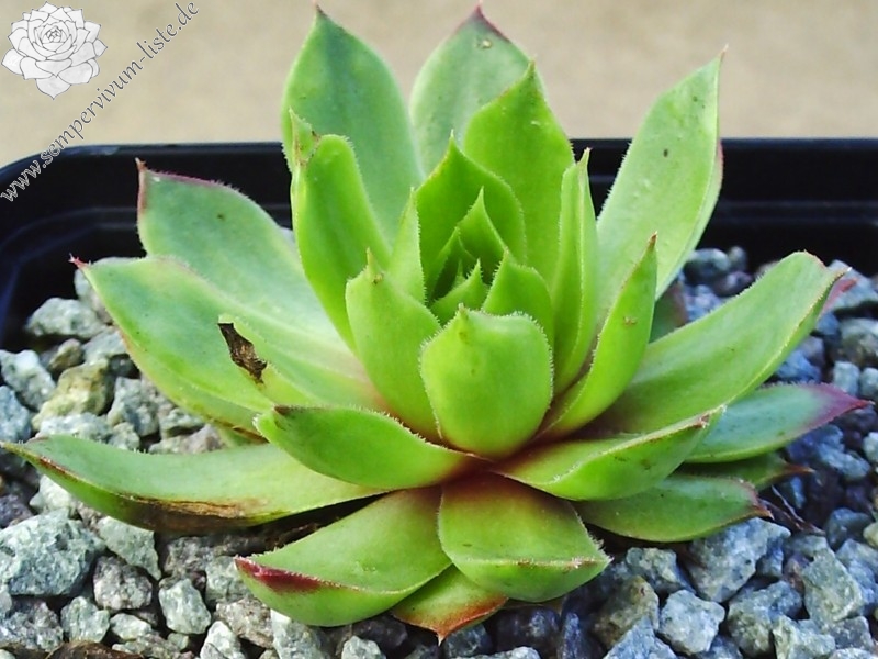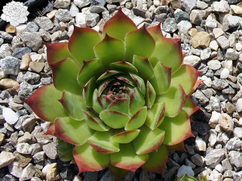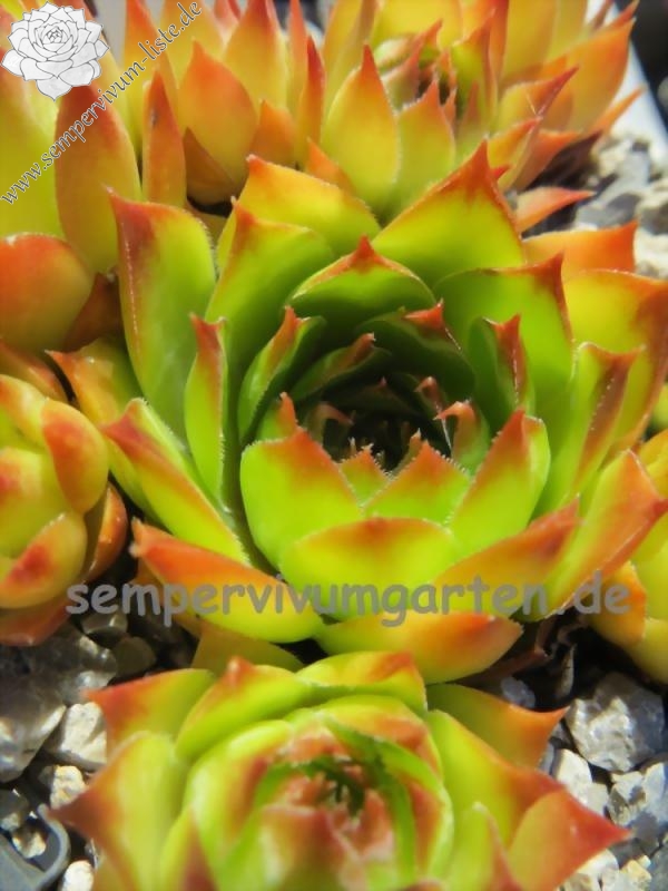 Sempervivum 'Jupp' ist ein besonders schön gefärbter, frischgüner Dachwurz. Die Blattspitzen sind im Sommer schön orangerot gefärbt und heben sich gut von der frischgrünen Farbe ab. Die mittelgroßen Rosetten sprossen gut. Eine tolle Pflanze.