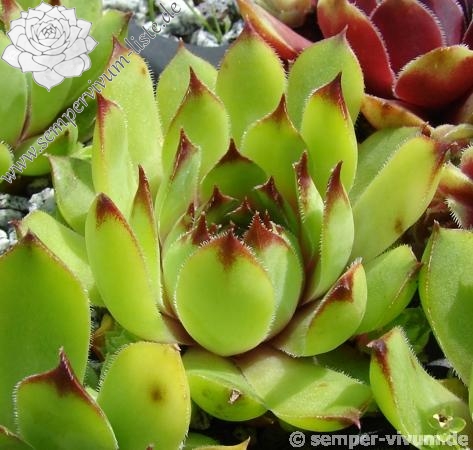 Mittelgroße Rosetten, mit kleinen roten Blattspitzen! Die dichten Polster wirken fast igelförmig!