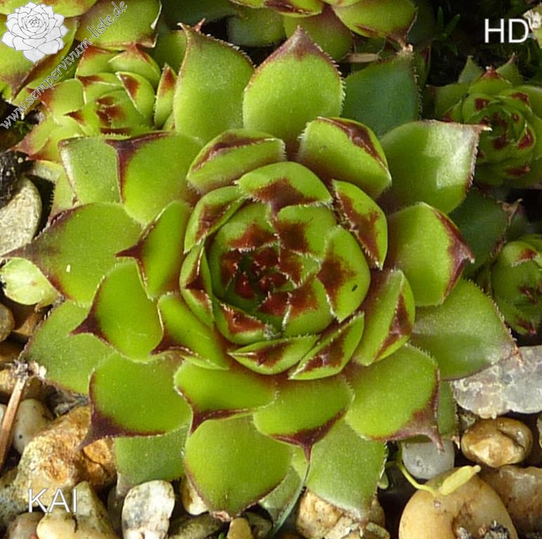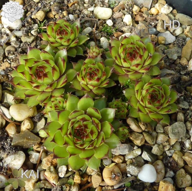 'Kai' formt mittelgroßen Rosetten in olivgrüner Farbe mit kleinen roten Blattspitzen. Die dichten Polster von Sempervivum 'Kai' wirken fast igelförmig. Ein wüchsige Auslese einer britischen Saatmischung von Thomson & Morgan.