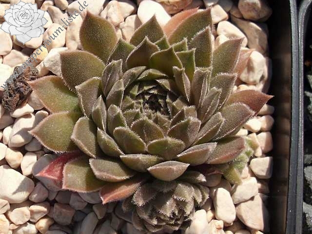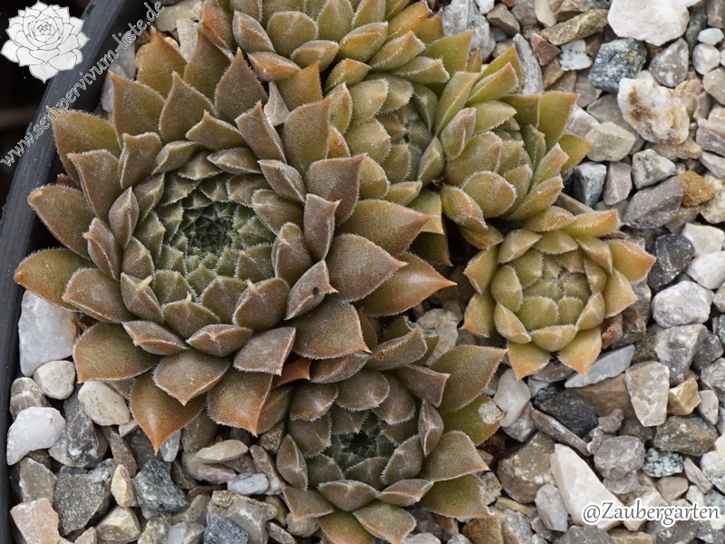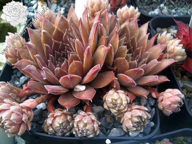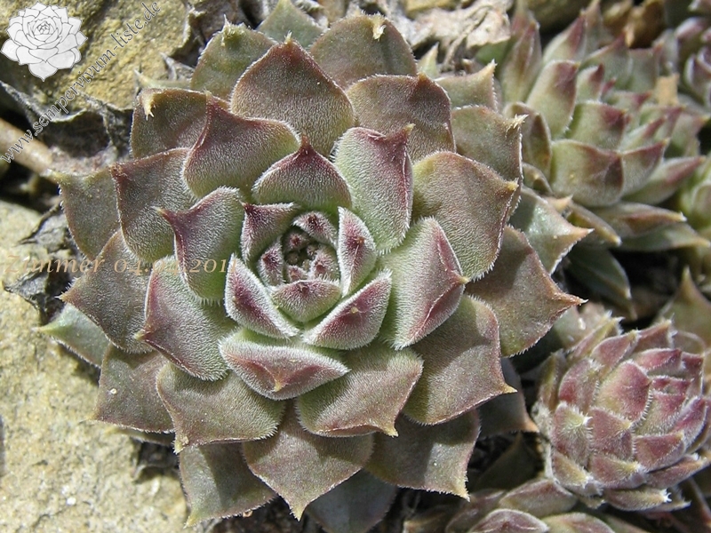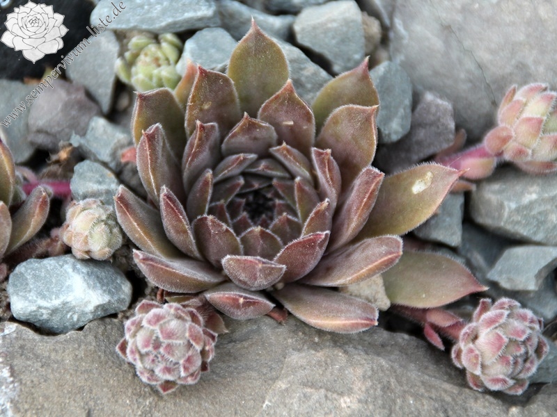 Rosetten 3-4 cm, braunrosa, bewimpert, viele Ausläufer