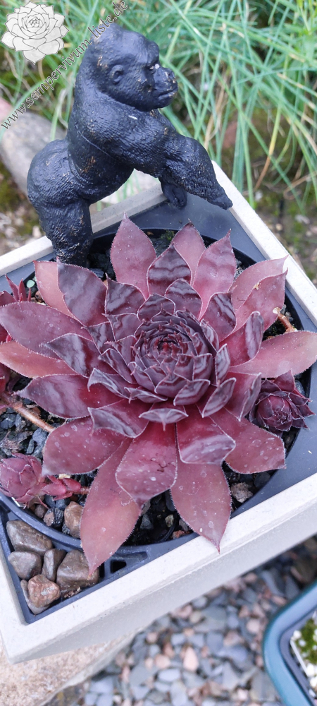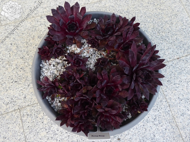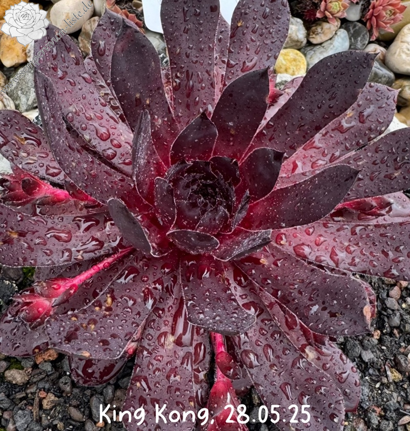 King-Kong hat ein fast schwarzes, kompaktes Zentrum, das ganzjährig schwarz- dunkelviolett gefärbt ist. Die Blätter um das Zentrum herum sind linealisch geformt. Die Blattspitzen silbrig marmoriert. Im Frühjahr zeigt er seine kräftigste, dunkle Färbung. Über die Sommermonate hinweg ist die Farbe jedoch etwas heller und dabei leuchten die äußeren schmalen, langen Blätter teils rötlich oder auch bräunlich rötlich. Ausgewachsene Blätter bilden in der Mittellinie eine deutlich spürbare Verdickung. Die Blattränder sind ganz fein bewimpert. Die Pflanze benötigt sehr viel Platz. Mit 6-8 Kindel die an bis zu 25cm langen Stolonen mit der Mutter verbunden sind kindelt er gut.