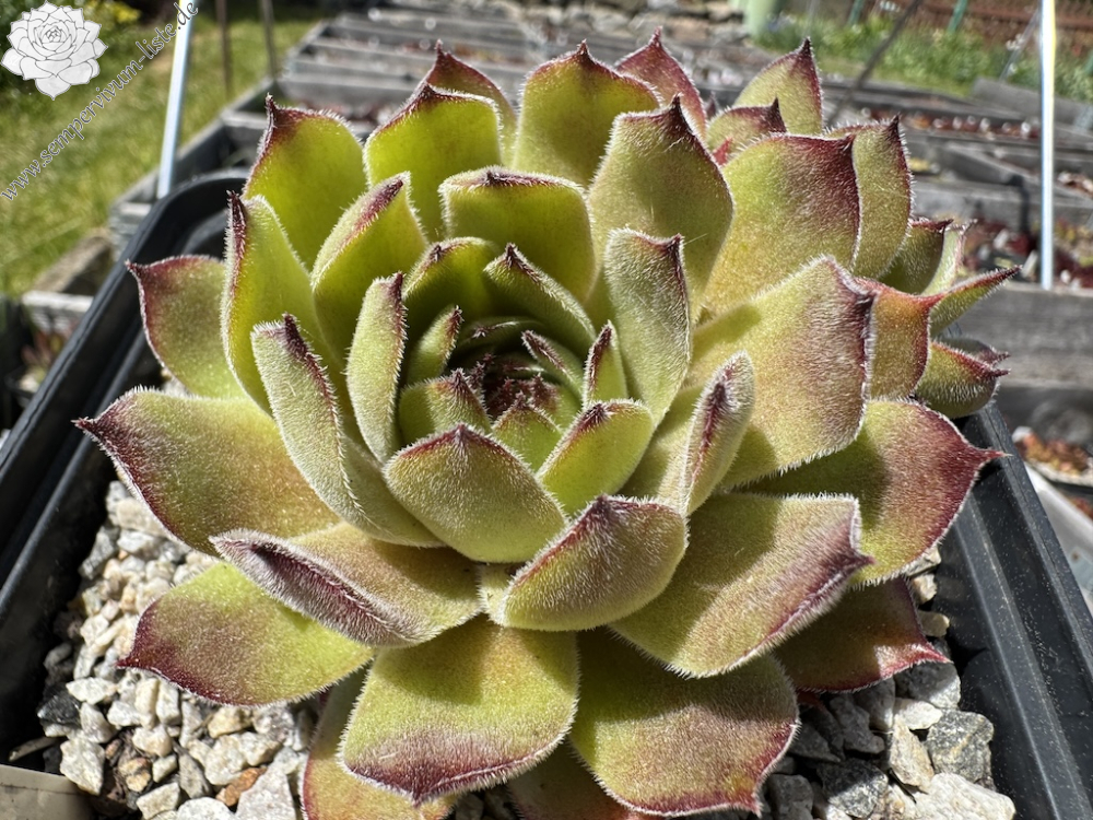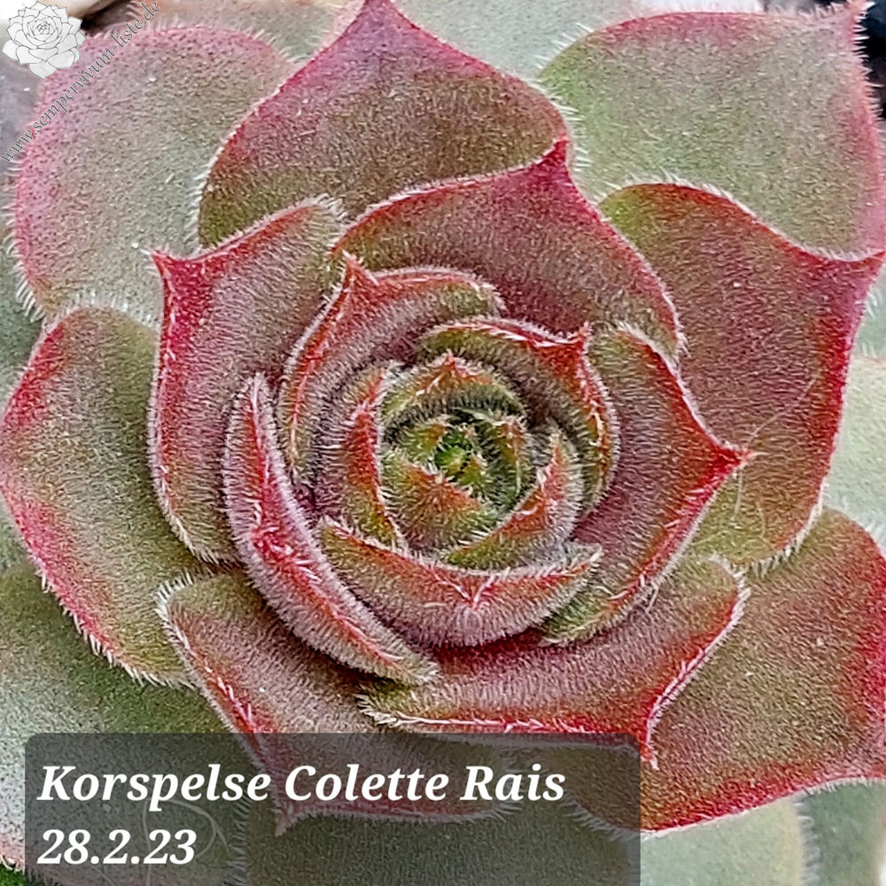 Rosetten bis 4 cm, Blätter eiförmig, kurz bespitzt, Mischfarben pastellrosa - pastellgelb, Spitzen dunkelbraun, bewimpert
