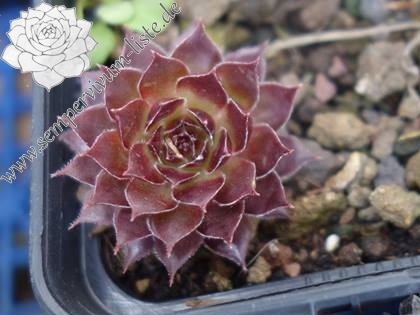 Rosetten bis 6 cm, Blätter oval, lang bespitzt, karminrot