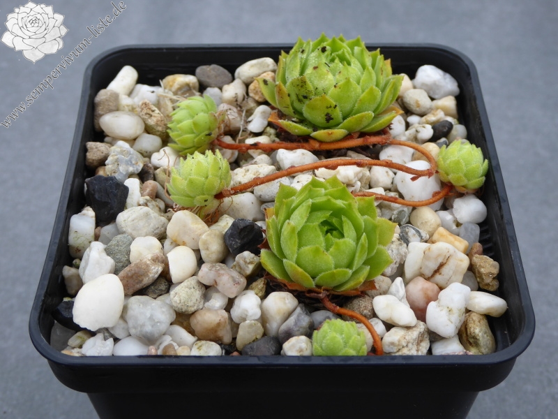 Rosetten bis 6 cm, Blätter rundlich, kurz bespitzt, lindgrün, Spitzen etwas braun, Ableger an langen rötlichen Stolonen