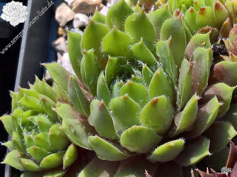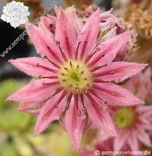 Die Blätter besitzen auffallend lange Randwimpern. Sie formen Rosetten mittlerer Größe von bis zu acht Zentimetern und haben bereits im ersten Jahr großen Zuwachs. Unser Zufallssämling zeigt insbesondere im Sommer eine ungewöhnliche Färbung. In manchen Jahren hat er im Juli eine cremegrün-gelbe Tönung. Auch die rosafarbenen Blütenblätter sind eine Besonderheit - sie sind jeweilis zur Mitte leicht weiß gestreift.