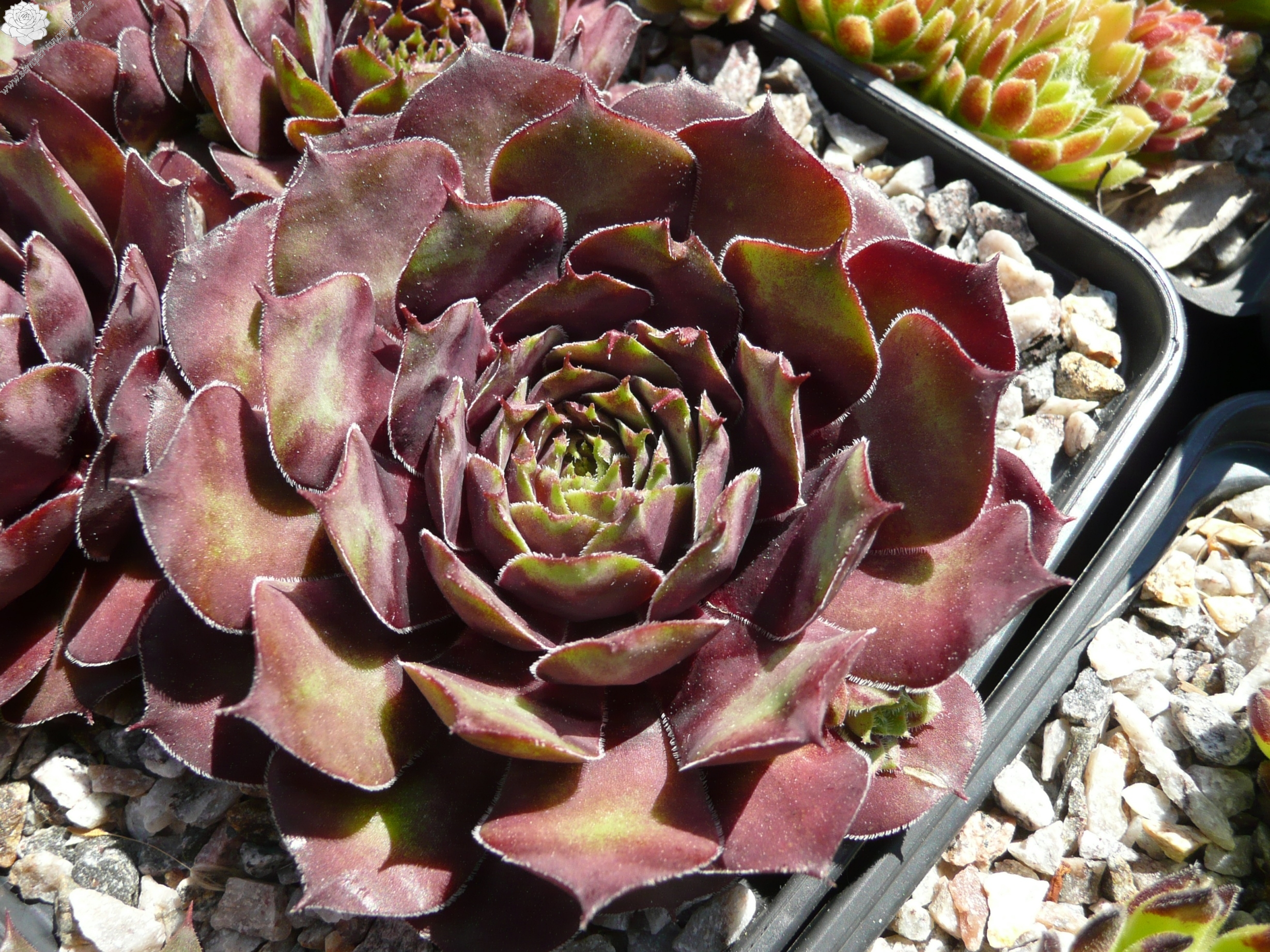 Sempervivum 'Lady of Haccombe' ist ein auffallender Hauswurz. Die größeren Rosetten wirken etwas düster und sprossen gut. Eine wirklcih interessante Erscheinung!