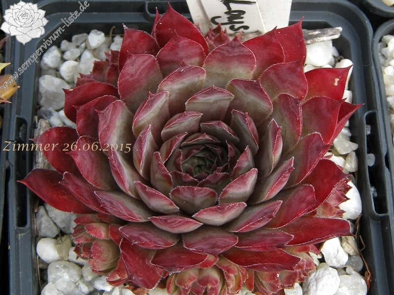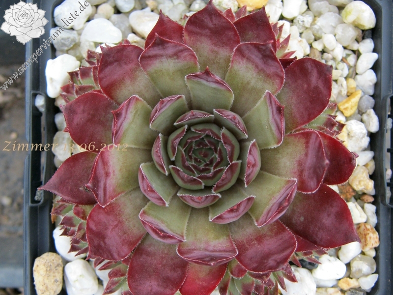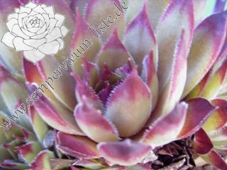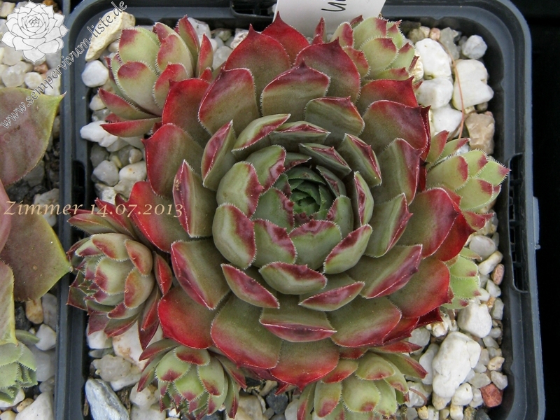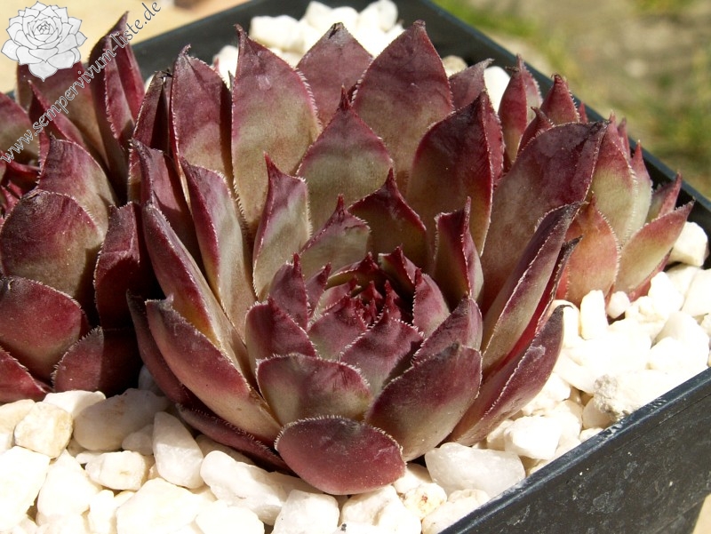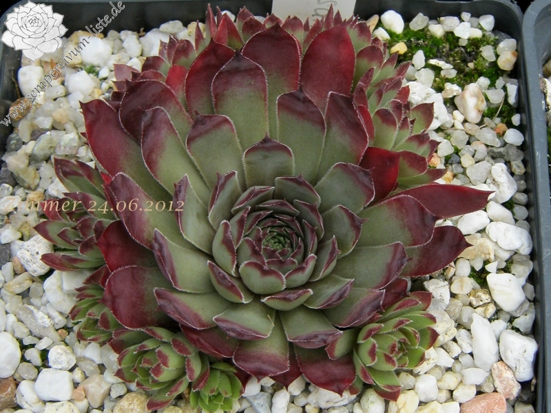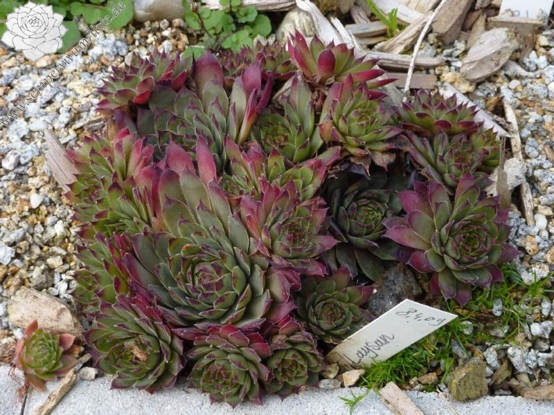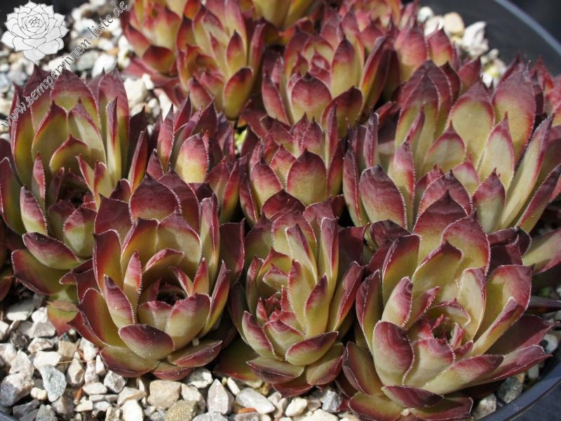 Graugrüne Rosetten mittlerer Größe, mit breiten, kräftig purpurbraunen Blattspitzen; Hybride mit S. wulfenii.