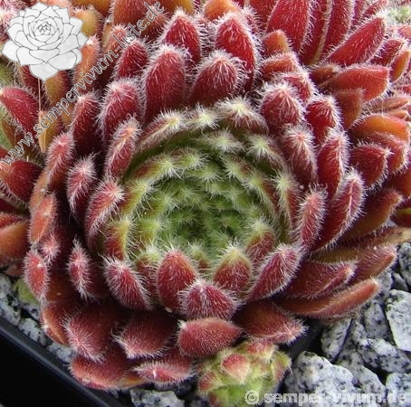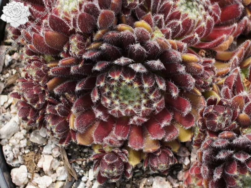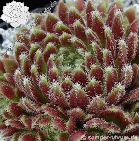 Die kleinen, roten Rosetten sitzen ganz eng zusammen und bilden dichte Polster. Die weiße Behaarung rundet das Bild schön ab. Die intensive Färbung bleibt auch gut im Sommer erhalten. Ein kleines Schmuckstück!