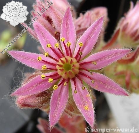 Eine neue Hybride von Andre Smits aus Belgien. Die Sorte formt kompakte Polster mit wolligen, kleineren bis mittelgroßen Rosetten. Im Frühjahr in leuchtend himbeerroter Farbe mit grünem Zentrum. Zudem schöne, sternförmige Blüten in Rosarot.