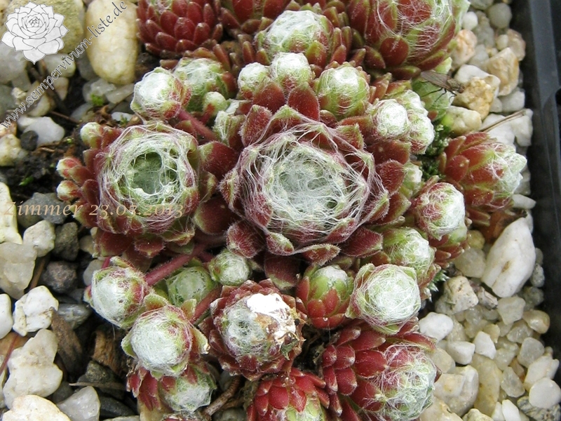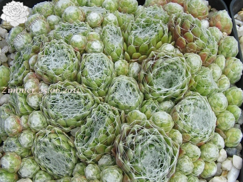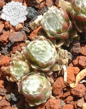 Rosetten 3 cm, grünrosa - weiß, viele Spinnweben, Blüte dunkelrosa, ein Elternteil S. arachnoideum