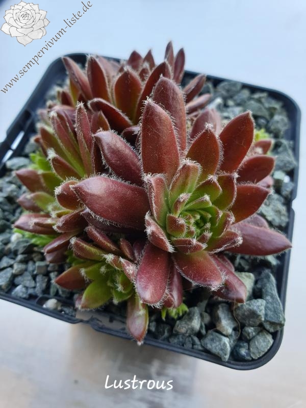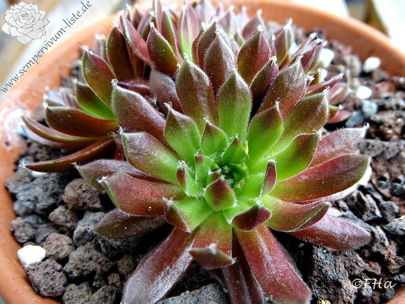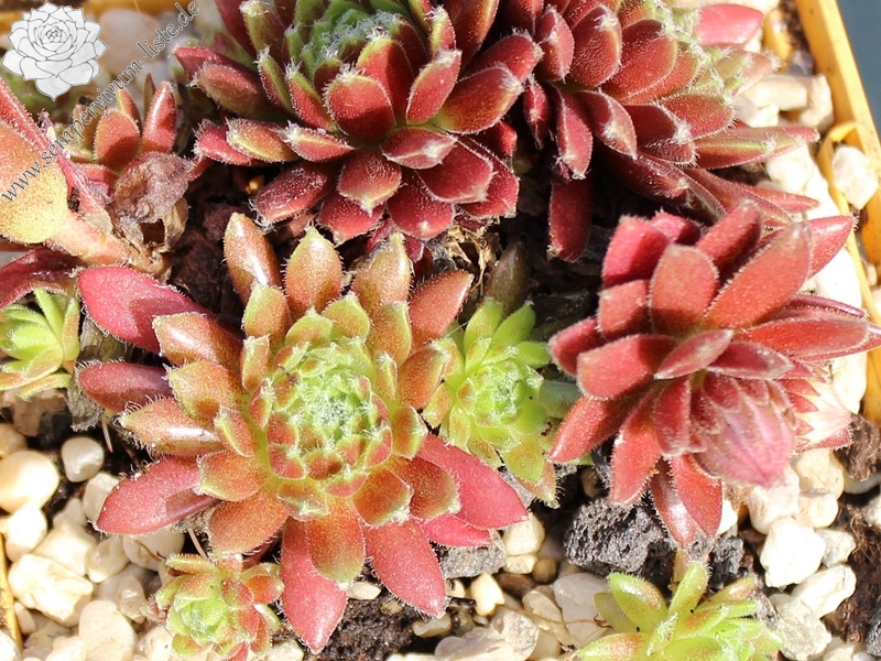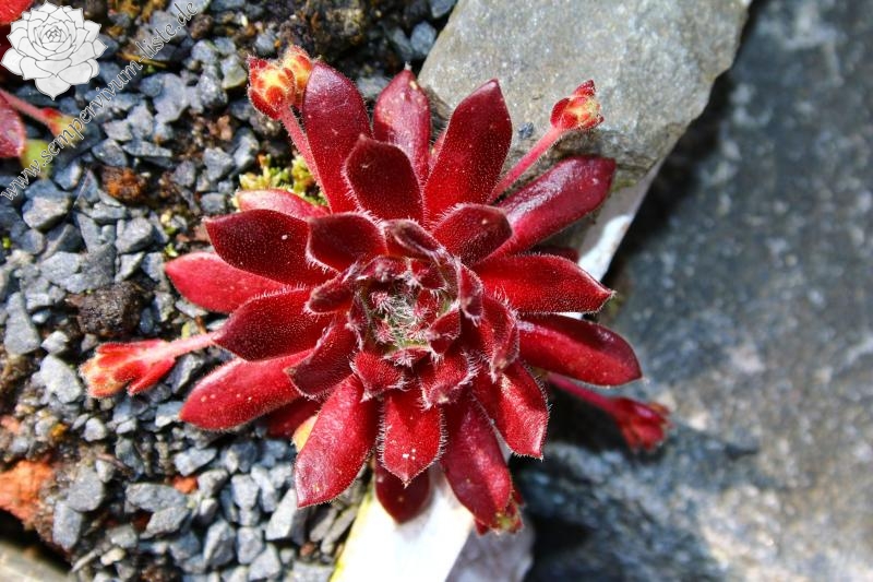 Eine besonders ausgefallene Hybride mit arachnoideum Blut: die eher kleinen Rosetten sind während der Frühjahrs- und Sommermonate blurot gefärbt, doch das Zentrum bleibt grünlich