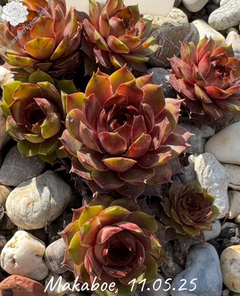 Ein Kind der 80er Jahre mit typischen Eigenschaften von Züchtungen aus dieser Zeit. S. 'Makaboe' formt mittelgroße Rosetten mit S. tectorum Blut. Sie zeigen ein helles Olivgrün mit pastelrosafarbenem Zentrum während des Sommers.