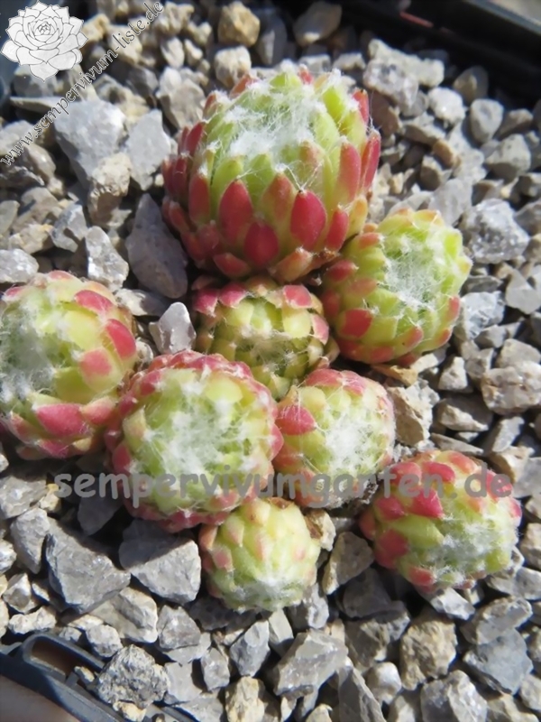 Die Rosetten sind relativ klein und formen dichte Polster. Zum Sommeranfang ist 'Makora's' sehr auffallend durch den leuchtend roten Ring, der optisch durch die tolle Färbung auf der Rückseite der äußeren Laubblätter entsteht. Eine sehr kompakte Sorte aus der Gruppe der Spinnwebhauswurzen.