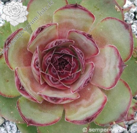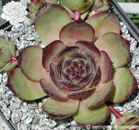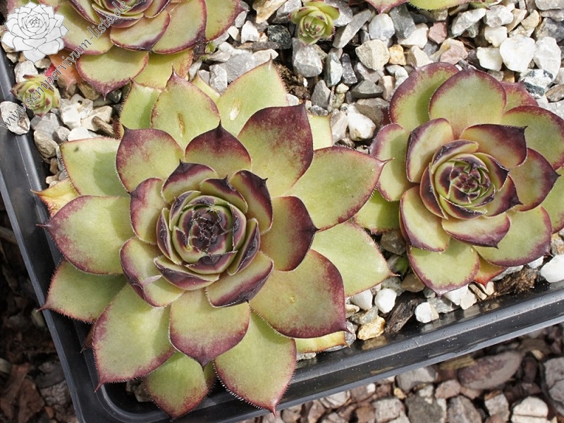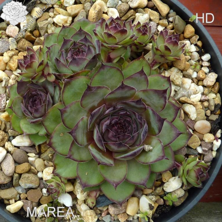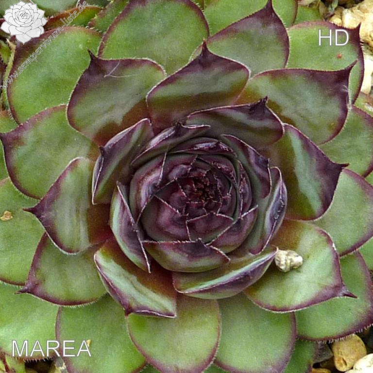 Diesen Sämling benannten wir zu Ehren einer Sempervivum-Sammlerin aus Oregon. 'Marea' formt mittelgroße, flache Rosetten in hechtgrauer Färbung. Die Blätter sind auffallend breit und ab der Mitte bis zu den Spitzen mit violett bemaltem Rand. Die Tochterrosetten sitzen an rötlichen Stolonen.