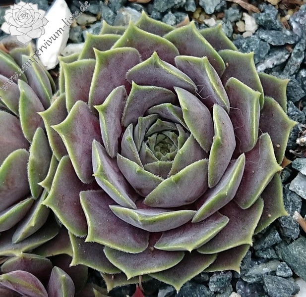 Erwin Geiger: Bläulich violette Rosetten, mit olivgrünen Spitzen und Rändern. Die samtigen Blätter verleihen den kleineren Rosetten einen silbrigen Schimmer; bildet kompakte Polster und wächst langsamer – selten echt in Kultur!