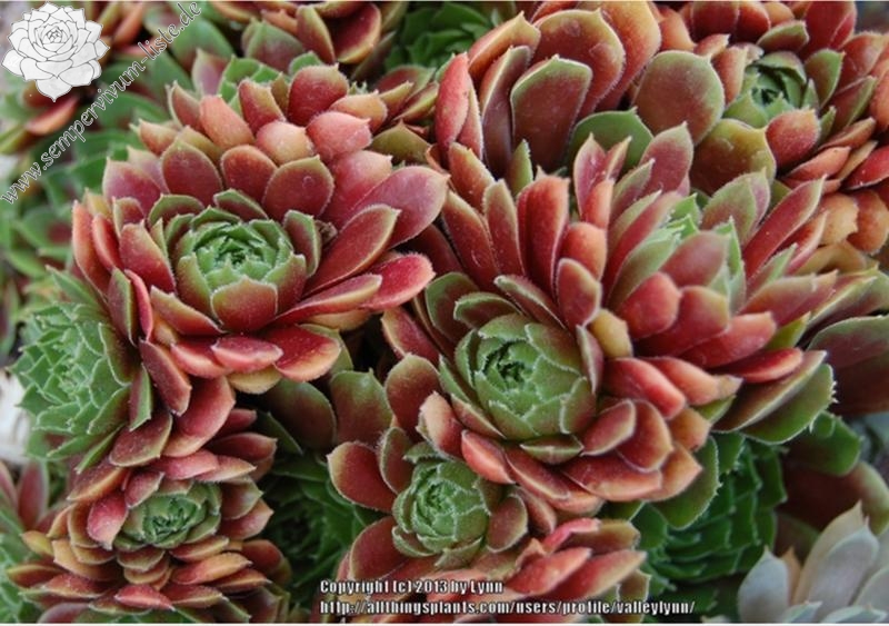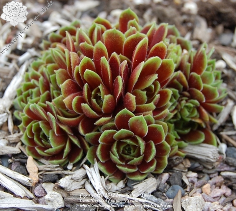 Helle, frischgrüne Pflanzen, mit rotem Rosettenzentrum. Ein Elternteil soll Sempervivum marmoreum gewesen sein. Eine sehr wüchsige Hybride, die dichte Polster bildet.