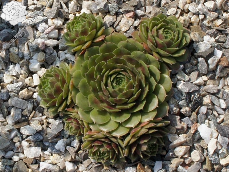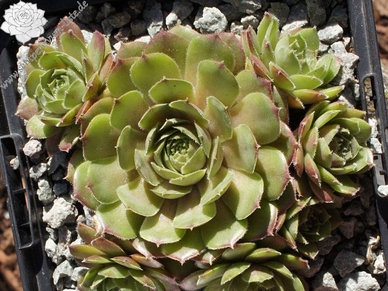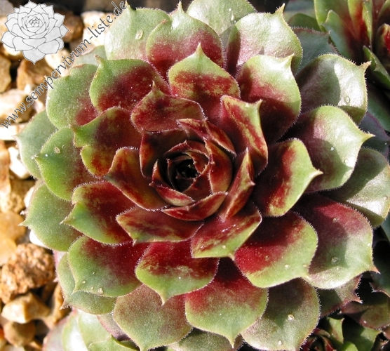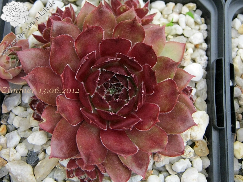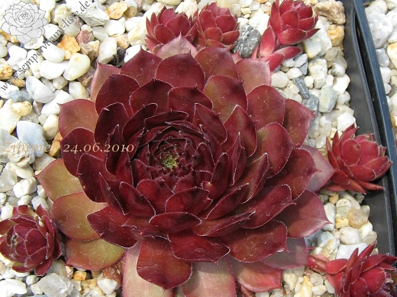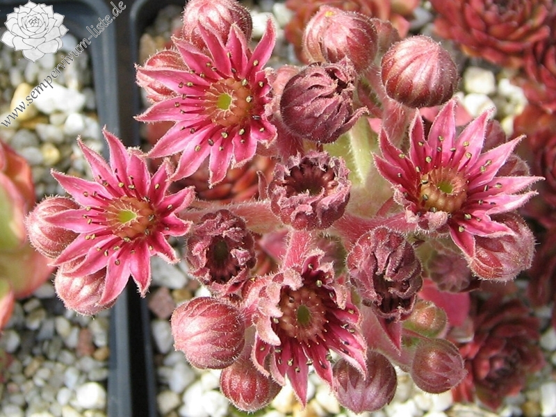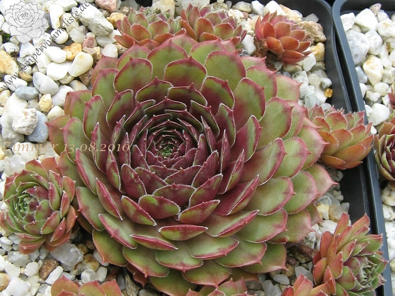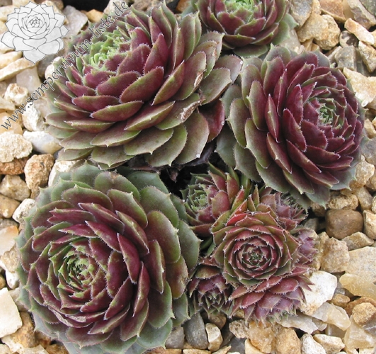 6 - 8 cm große, flache Rosetten , Basis grau - grün, Spitzen dunkelpurpur, Blüte dunkelrot, 15 cm hoch