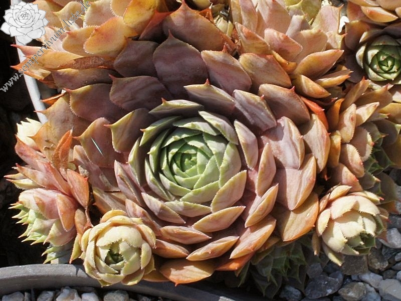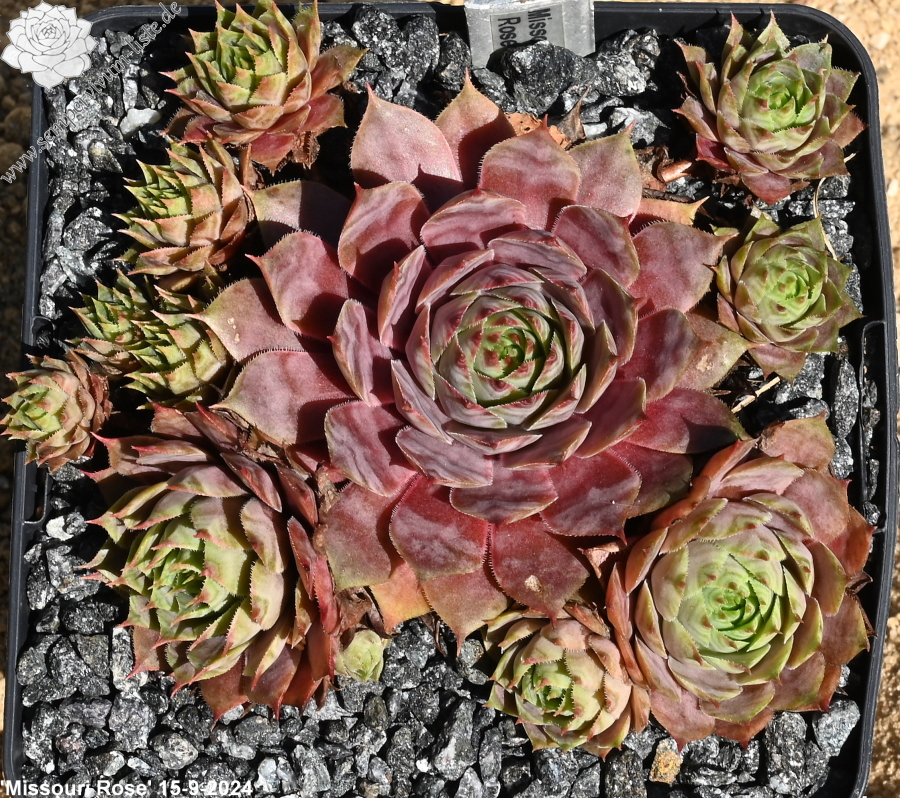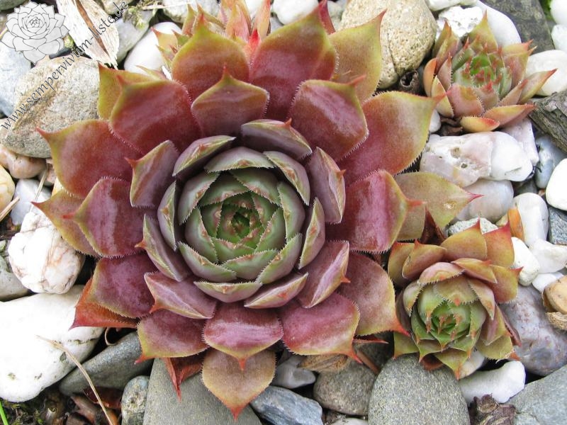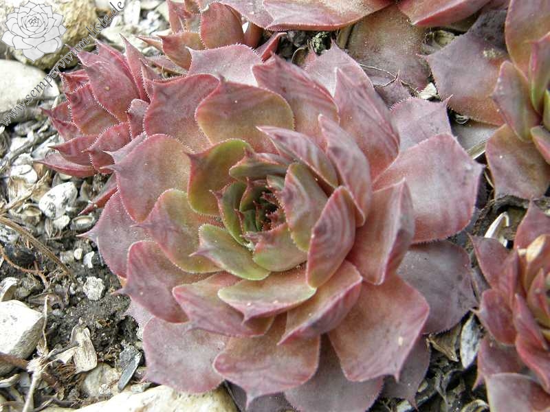 8 cm große Rosetten, gedecktes rot, innen hellgrün, Spitzen braunpurpur überhaucht