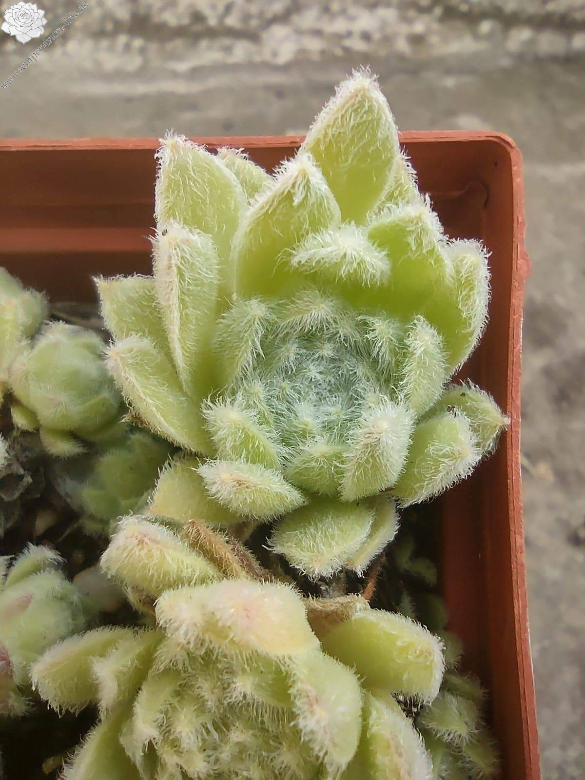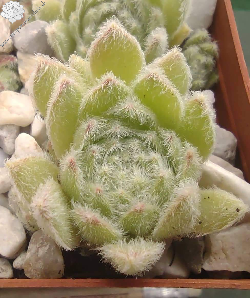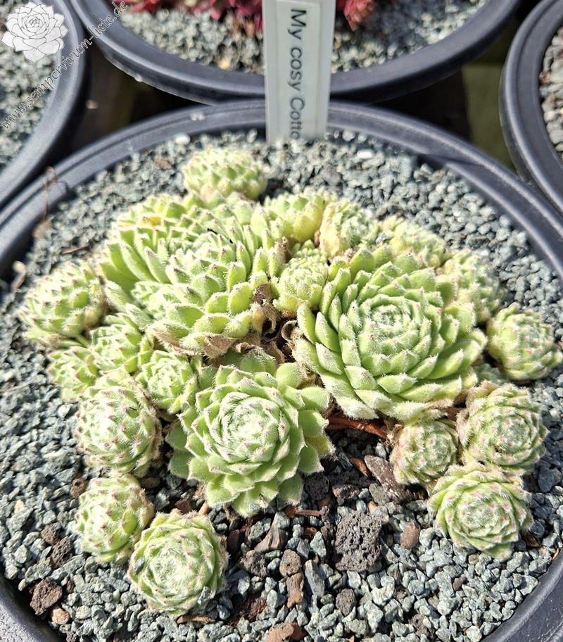 Diese Sempervivum besticht durch einen ganzjährigen pastelligen Grünton. Durch ihre starke Behaarung fühlt sie sich superweich an; eben wie "cosy cotton" (kuschelige Baumwolle)