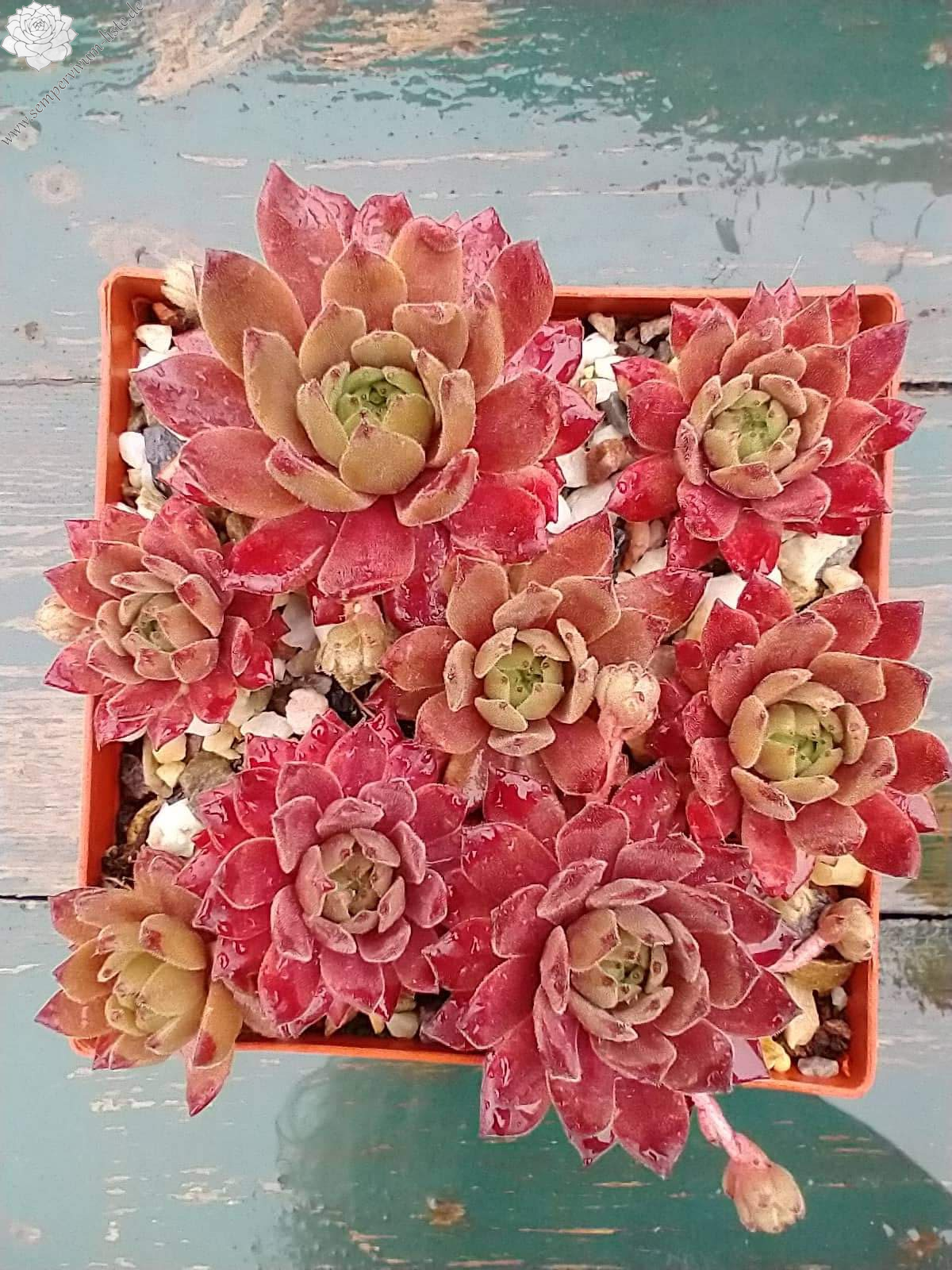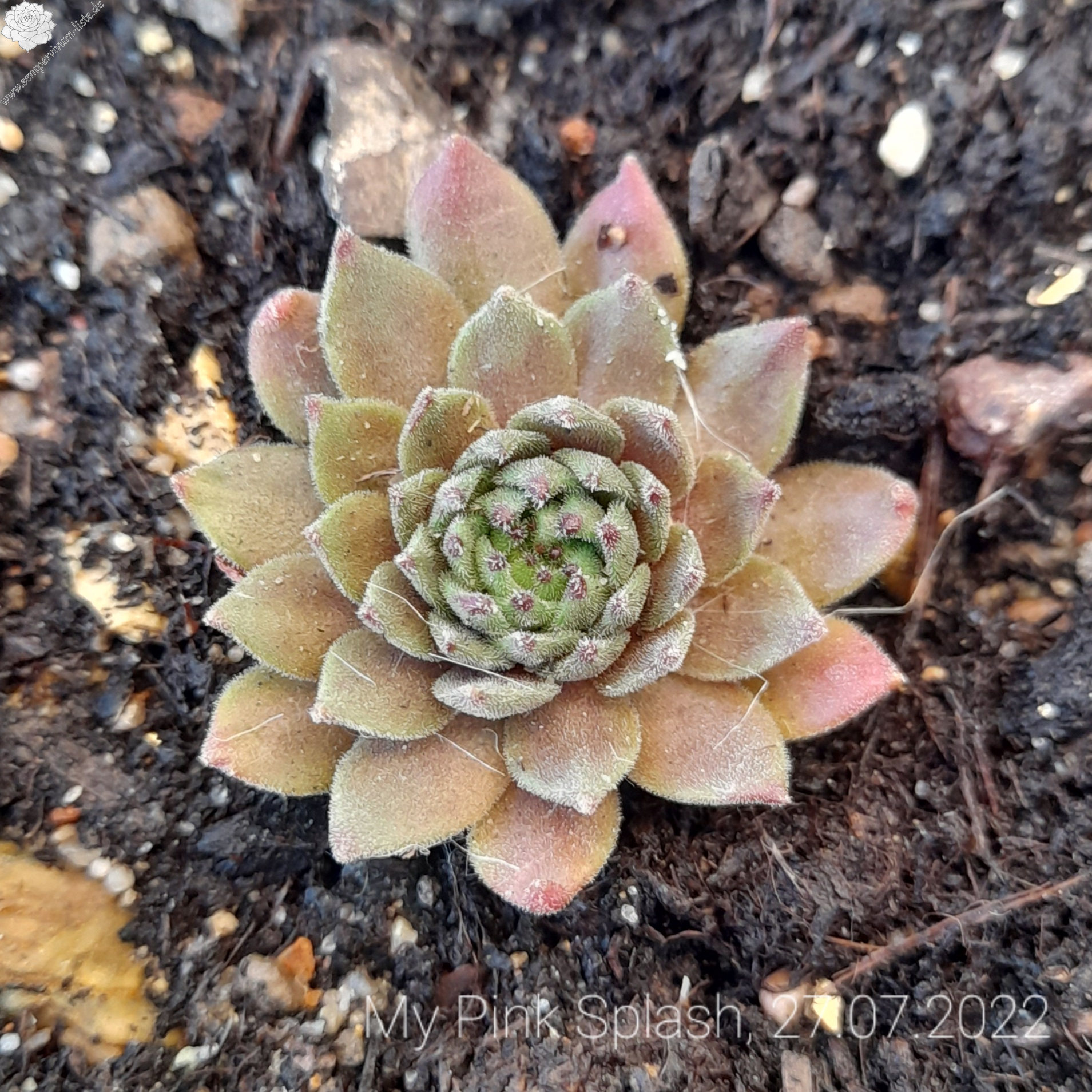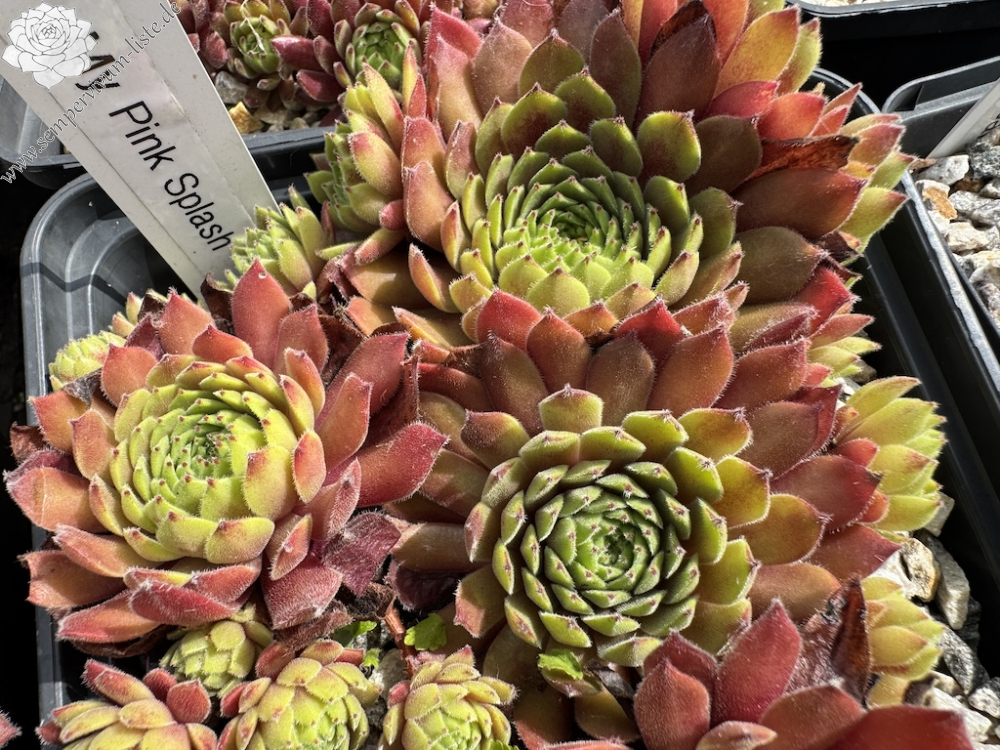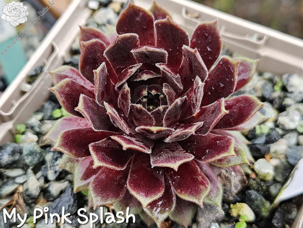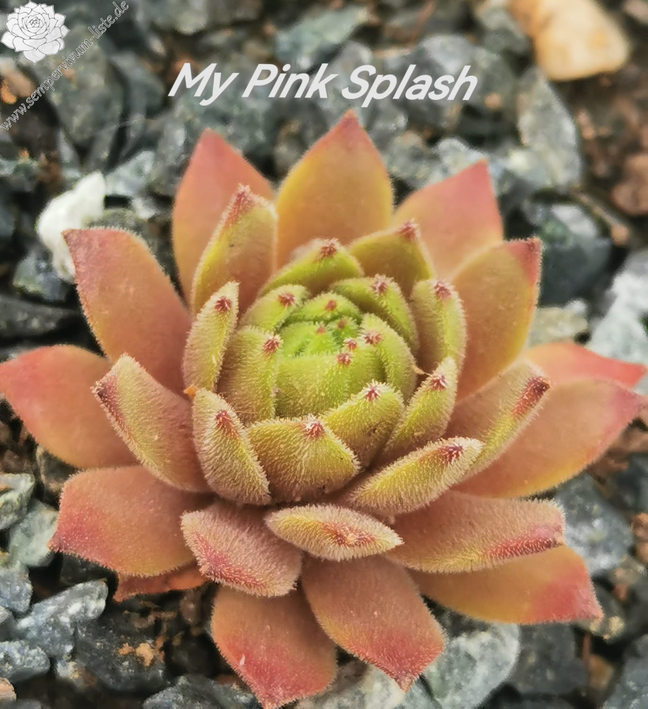 'My pink Splash' ist eine über das Jahr sehr bunte, samtige Sorte. Ende April entwickelt Sie ein besonderes Pink, welches sich in den Sommermonaten in den Blattspitzen absetzt. Die Sorte kindelt mäßig. Den Namen erhielt die Sempervivum durch ihre Farbe und Blattform, welche wie ein wie Wasserplatscher aussieht. Das Gemälde „A Bigger Splash“ von David Hockney trug zusätzlich zur Inspiration bei. Wie alle anderen Züchtungen ist sie winterhart und sehr robust.