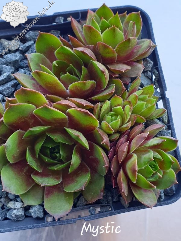 Der Brite aus den 80er Jahren stammt aus der Zuchtarbeit von David Ford. 'Mystic' formt mittelgroße Rosetten in glühend orangeroter Frühjahsfärbung. Zum Sommer wandeln sich die Farben in ein leuchtendes Grün. Die Blattspitzen sind während dieser Jahreszeit in ein pfirsichfarbenes Rosa getaucht.