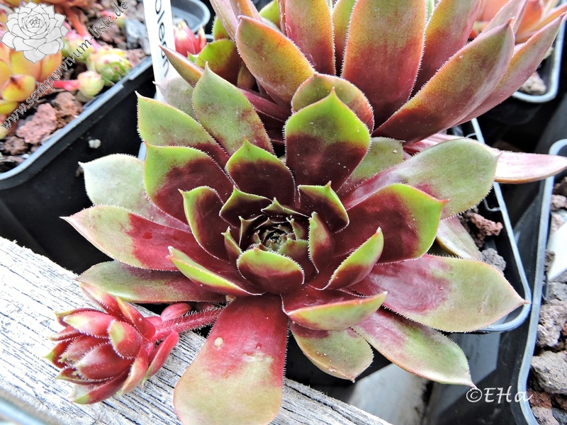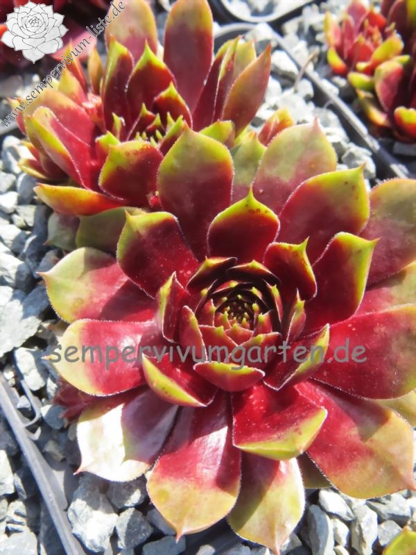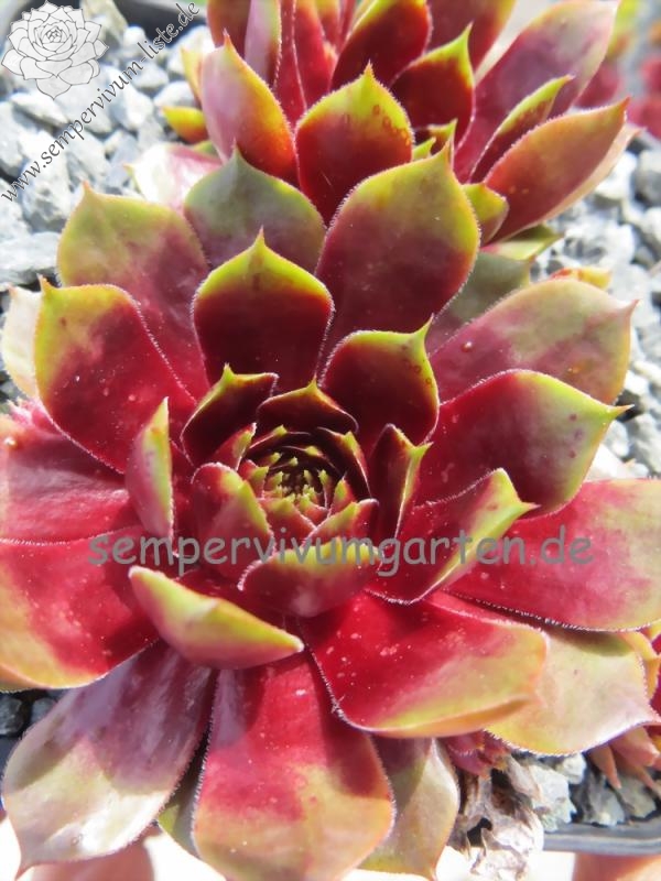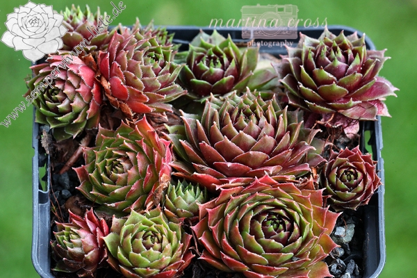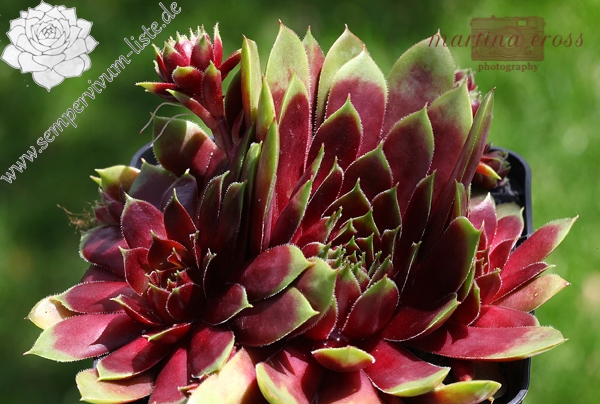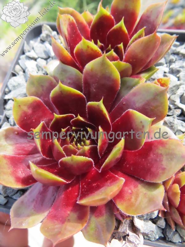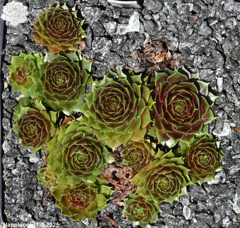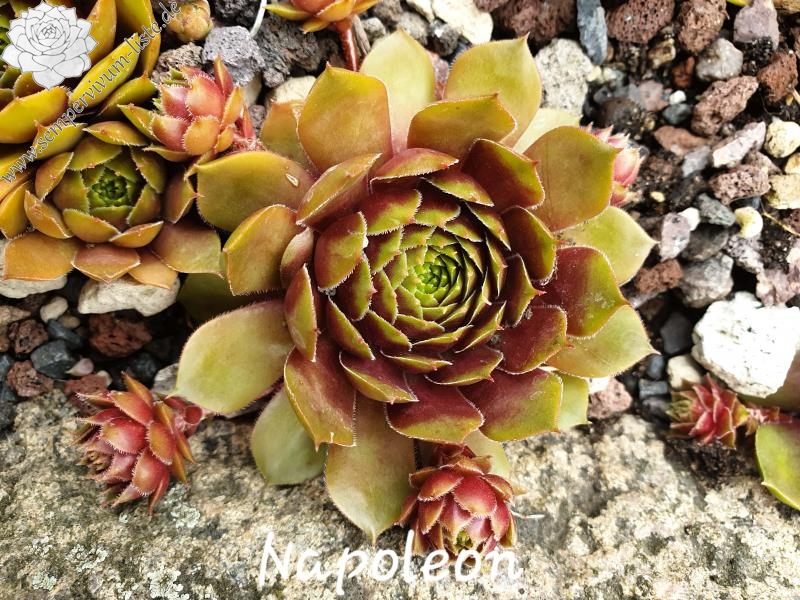 Sempervivum 'Napoleon' ist eine imposante Erscheinung. Dieser Hauswurz zeigt eine ganz elegante, offene Rosettenform. Die breiten Blätter unterstützen diese Wirkung reizvoll. Die auffällige, stabile Färbung bleibt im Sommer sehr gut erhalten. Wobei mir besonders der intensive Rotton im Zentrum gefällt, der im Frühsommer eine glänzende Wirkung besitzt. Die flachen Rosetten erreichen einen Durchmesser von 9 cm und sprossen willig. Die Pflanzen sind robust und kamen mit dem heißen Sommer 2015 gut zurecht.