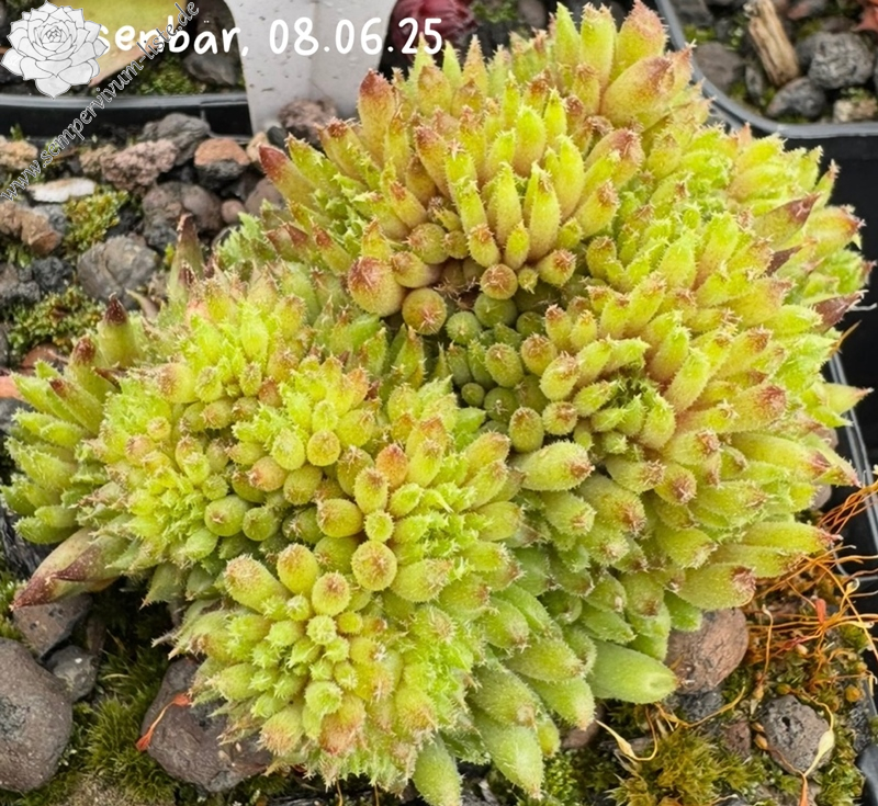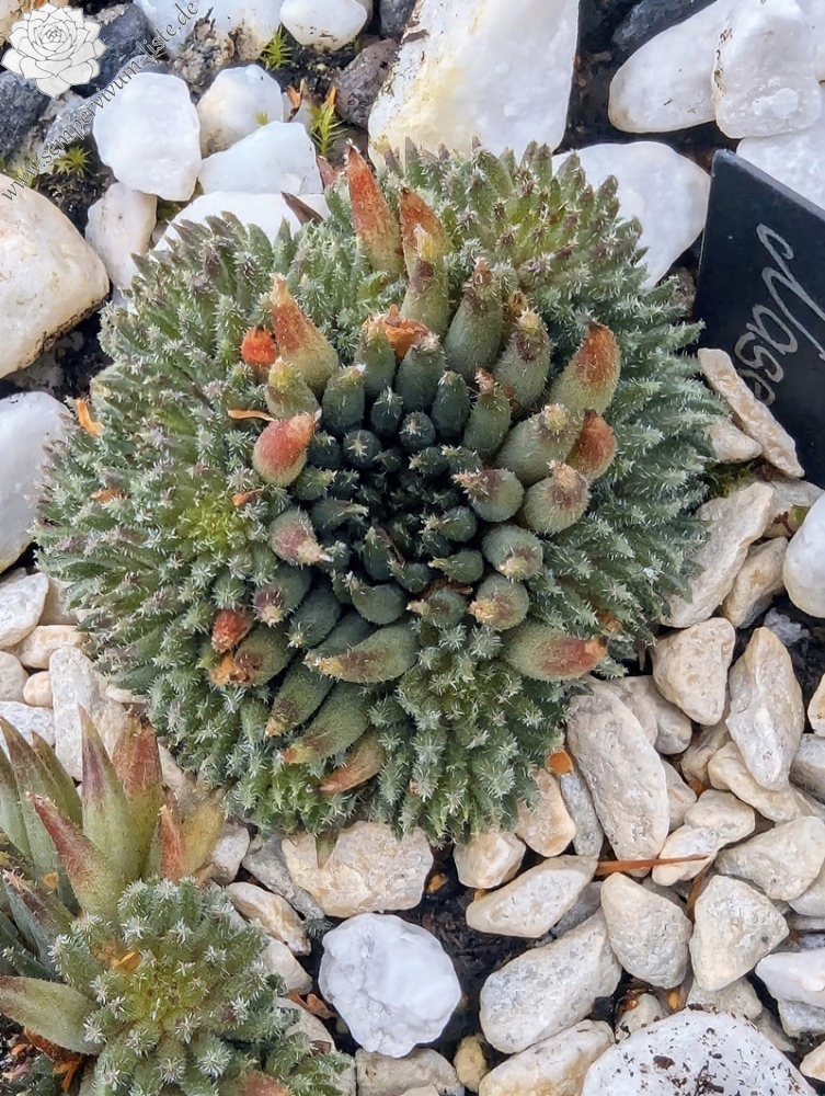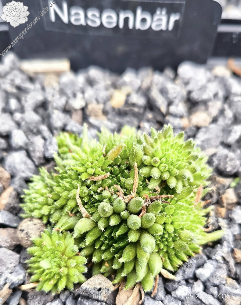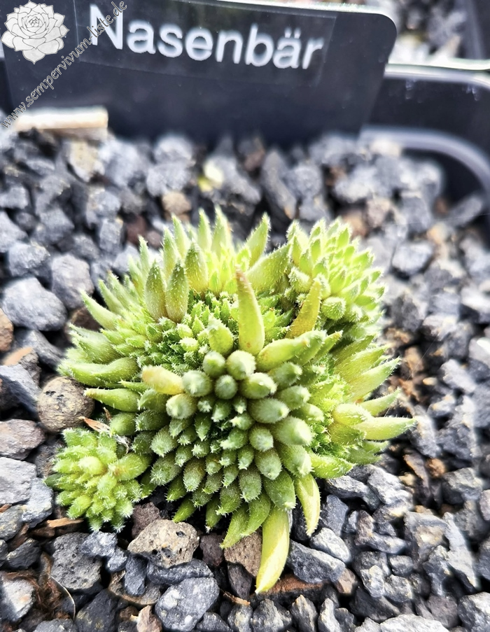Schon bald nach der Aussaat konnte man erkennen, dass sich ein an der Spitze geschlossener röhrenförmiger Sämling entwickelte. Nasenbär ähnelt vom Aussehen her auf dem ersten Blick Pinocchio ( II ) dessen Mutter auch Moby Dick ist. Farblich weichen sie besonders im März- April stark voneinander ab. Die Röhren von Nasenbär sind dicker, zeigen an jungen Kindeln eine olivgrüne Farbe, dessen Fuß weinrot schimmert. Während dem Wachstum werden die Spitzen der Röhren Aubergine farbig, die oft seitlich verbogen ist. Mit der Zeit wird die Röhre dann Aubergine farbig mit grünem Fuß. Das ergibt einen besonders schönen Kontrast. Die Röhren sind nur spärlich behaart, teilweise sitzen feine Puscheln an den Spitzen. Nasenbär kindelt sehr gut, teilweise an langen Stolonen jedoch auch ganz nah bei der Mutter. Lässt sich sehr gut teilen, verträgt Hitze, Nässe und auch Frost.