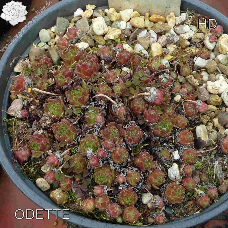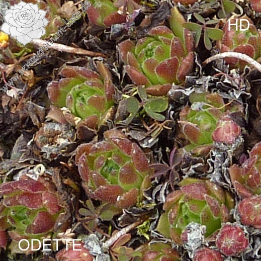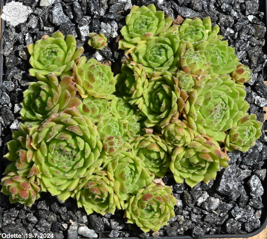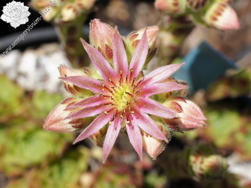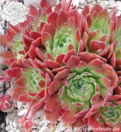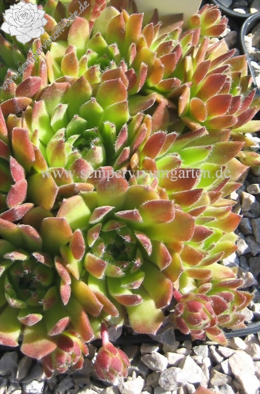 Eine hübsche, belgische Hybride mit apfelgrünem Laub. Zum Frühjahr verfärben sich die Blattspitzen in pfirsichfarbenes Rosa. Die Rosetten sind samtig behaart - vermutlich mit S. grandiflorum Blut.