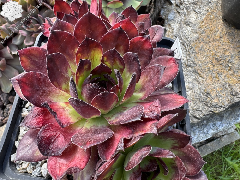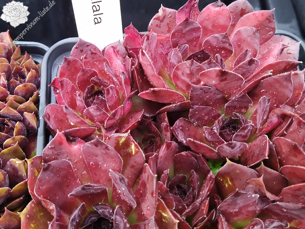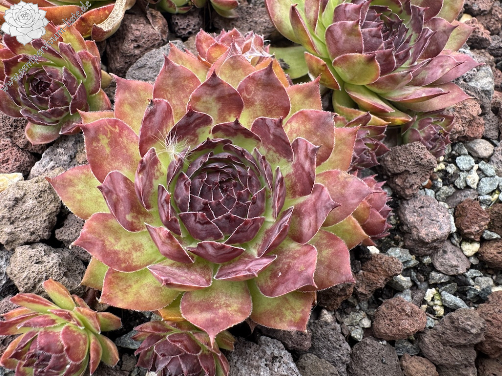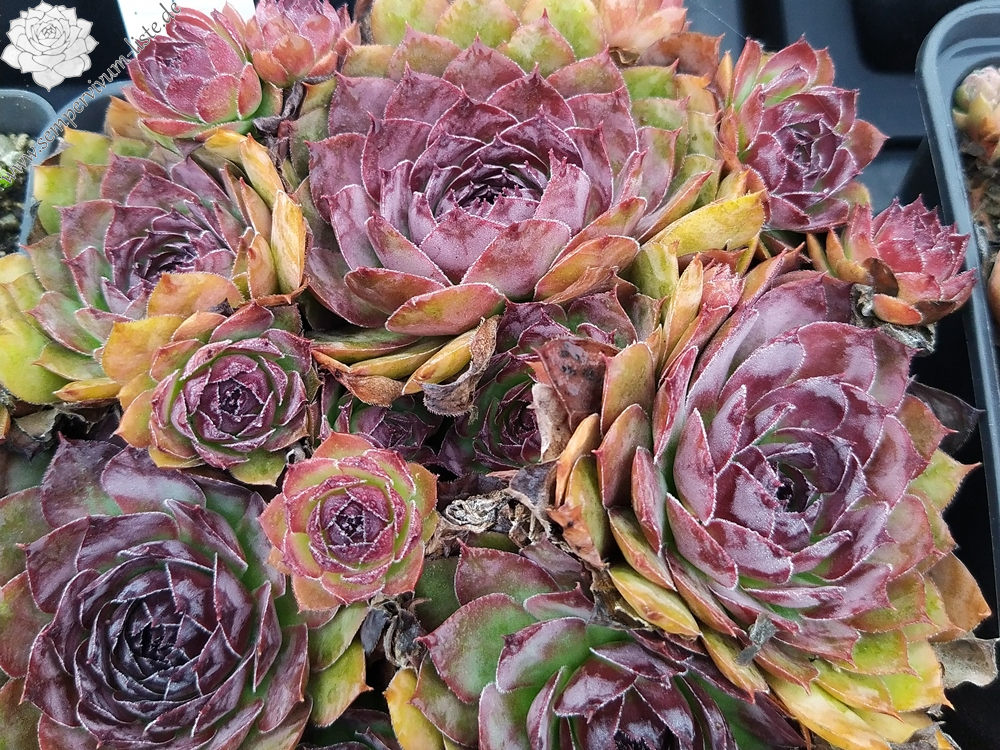 'Ogalala' bildet schöne, kompakte Rosetten, mit dicken, rundlich Blättern, die in einer stacheligen Spitze enden. Auf den Fotos kann man ganz feine Wimpern an den Blatträndern erkennen, die man so mit bloßem Auge kaum sieht. Die Rosetten sind 4-5cm groß und es können schöne Polster entstehen, da die Kindel gut in der Nähe der Mutter wachsen. Im Frühjahr sind die Rosetten rotbraun bis bordeauxrot mit einem leuchtenden Gelb, was aus der Mitte kommt. Im Sommer werden die Farben blasser um dann bereits ab Ende Juli in herbstfarben überzugehen. Das Gelb der Blätter aus der Mitte heraus wandelt sich in ein Grün und die Blattränder bekommen ein Farbgemisch aus gelb, rosa und lila. Ab Oktober geht er in einem Dunkelgrün mit rotbrauner Mitte und Blattenden in den Winter
