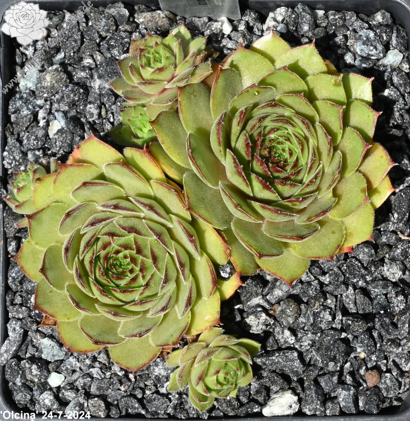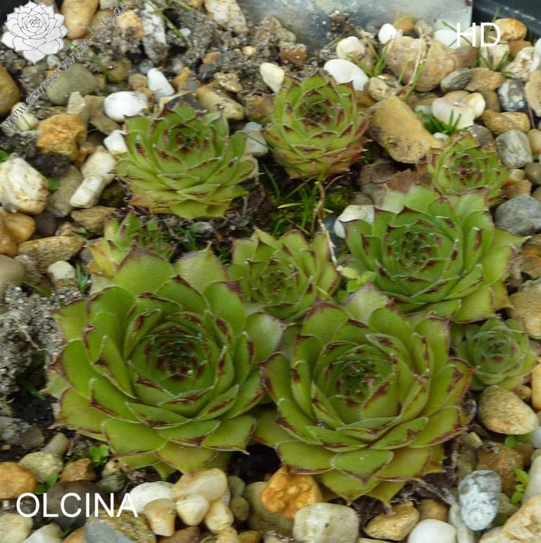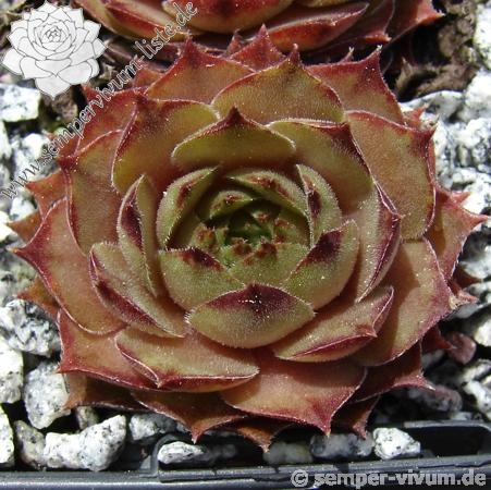Die neue Sorte aus Belgien formt recht runde Rosetten in olivgrüner Grundtönung. Zum Frühjahr mischen sich orange und braune Töne unter. Dann zeigen die Spitzen der relativ breiten, leicht behaarten Blätter eine rotbraune Farbe.