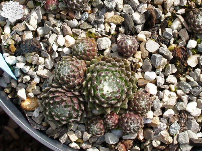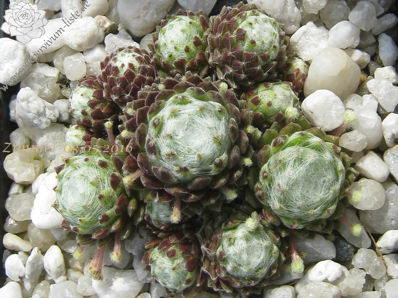 Mit Sempervivum 'Osorno' haben wir einen kleinen Spinnweb-Typen, der lockere Polster bildet. Das Zentrum ist dicht weiß besponnen und durch die hellgrüne Färbung der Blätter entsteht ein sehr kühles Bild.
