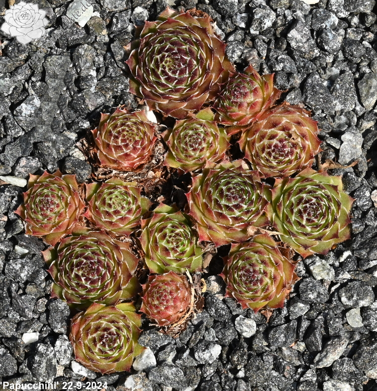 Dieser Hauswurz hat große Ähnlichkeit mit der spanischen Art S. cantabricum mit einer außergewöhnlichen Färbung in Bronze, die sich zur späteren Jahreszeit mit Olivgrün vermischt. Der Blattrand ist mit unzähligen weißen Wimpern gesäumt. Gerade bei direkter Sonneneinstrahlung fasziniert diese Eigenschaft durch eine auffallend silbrige Erscheinung. Die Blattoberfläche ist leicht samten. Die eher mittelgroßen Rosetten sprossen willig. Zeitweise ähnelt 'Papucchini' auch an die Rotspitzenhauswurzart Sempervivum (S. calcareum) mit bronzefarbenem Laub. Es ist ein Sämling von der S. marmoreum Hybride 'Chocolate'.