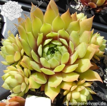 Der Name sagt bereits, was dieser Sämling von 'Lemon Kiss' zu bieten hat: Im Frühling haben die mittelgroßen Rosetten noch einen auffälligen Anteil Rosa an der Blattbasis. Zum Sommer verschwinden diese Pigmente von Tag zu Tag mehr und das ganze Polster erfreut uns ab dieser Zeit mit seinen barokken, cremefarbenen Farbverläufen.
