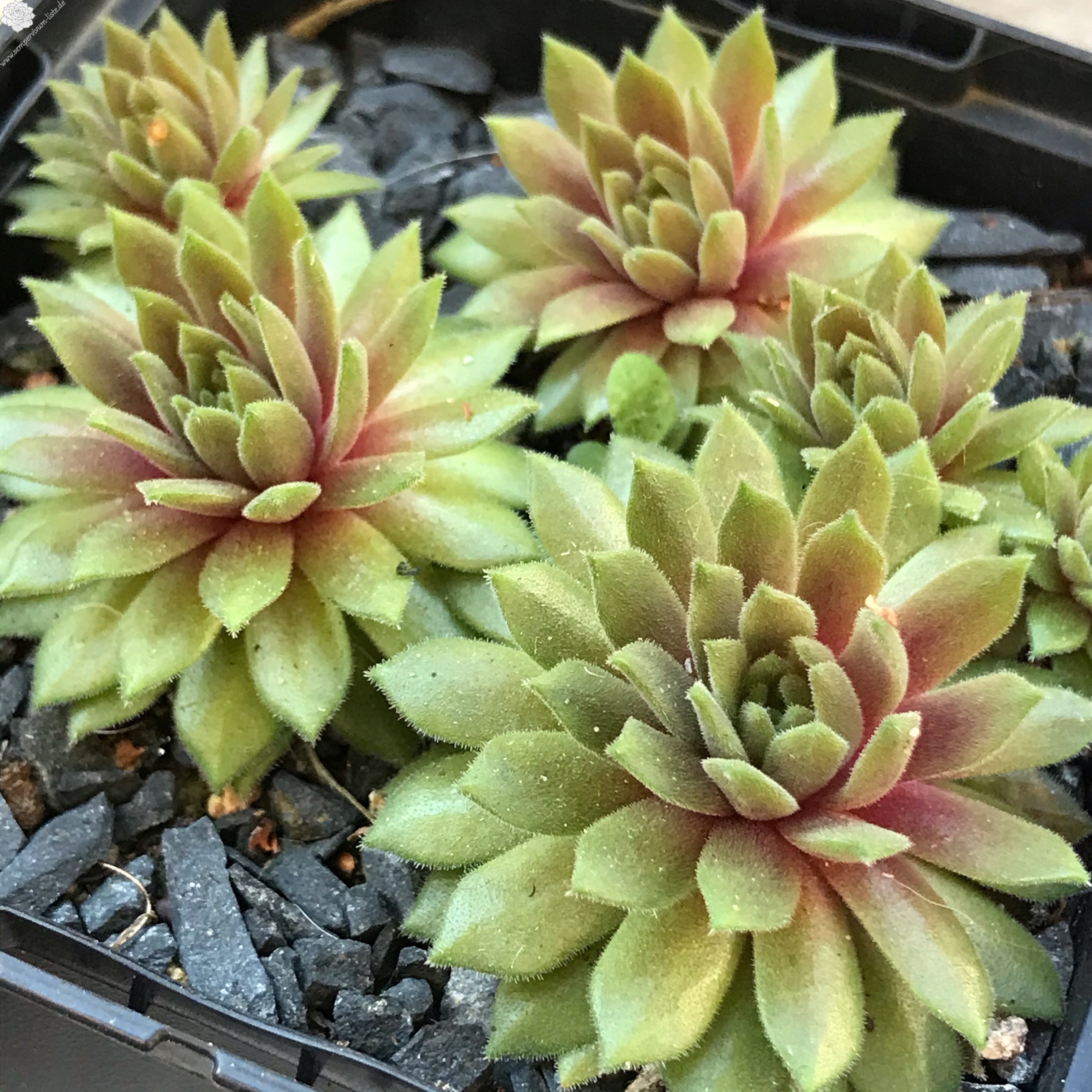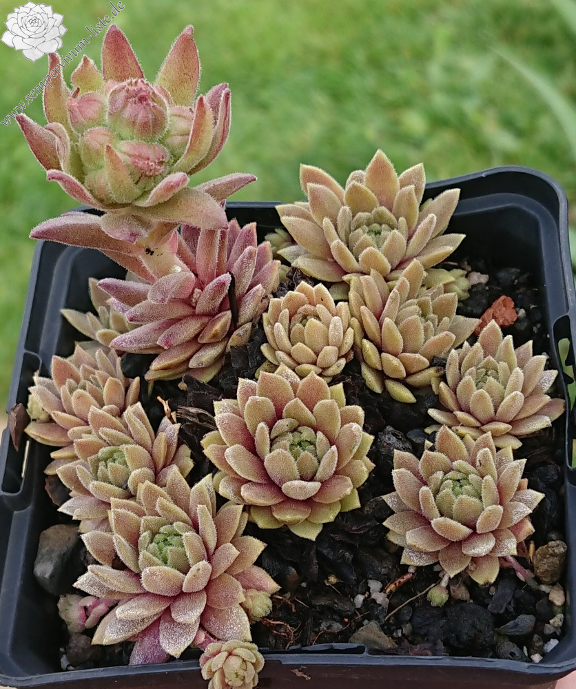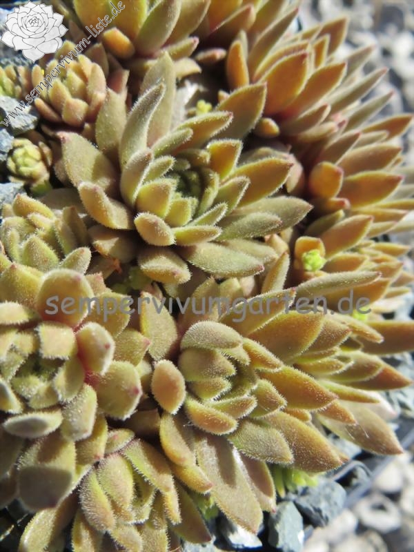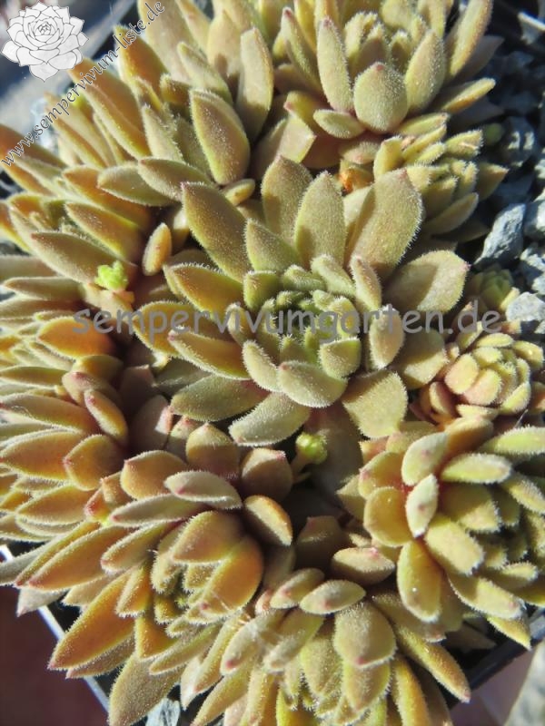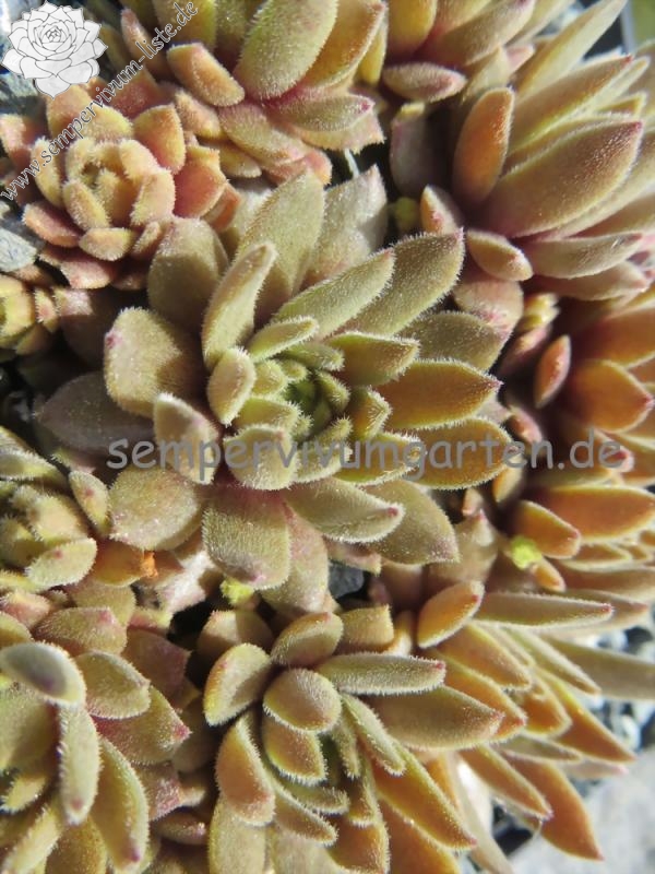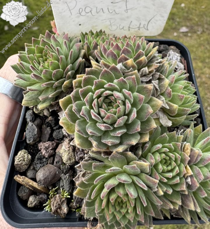 Mit Sempervivum 'Peanut Butter' haben wir einen kleinen Schatz. Die Rosetten erreichen einen Durchmesser von fast 5 cm und bilden dichte Polster. Die Pflanzen sprossen willig. Im Frühjahr zeigen die Pflanzen eine ganz gleichmäßige, erdnussbutterbraune Färbung. Die hellbraune, leuchtende Färbung bleibt sehr lange konstant. Im Sommer, bei höheren Temperaturen und trockenen Standort, färben sich die Pflanzen heller und bilden ganz feste, dichte Polster. Besonders bei den kleinen Hauswurz ist die nähere Betrachtung sehr wichtig, damit man auch die vielen Feinheiten erkennen kann. Bei 'Penut Butter' fällt die ganz feine Behaarung der Rosetten auf. Leider wurden bis jetzt noch keine Blüten gebildet.
