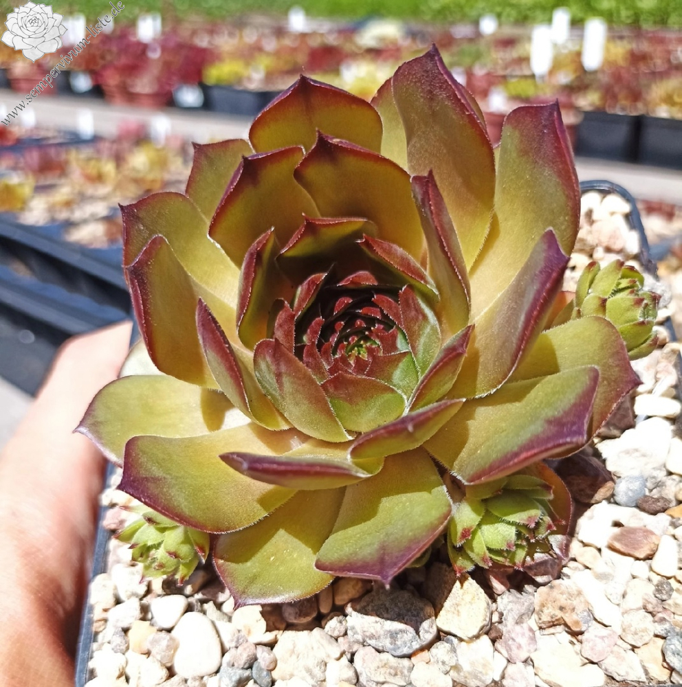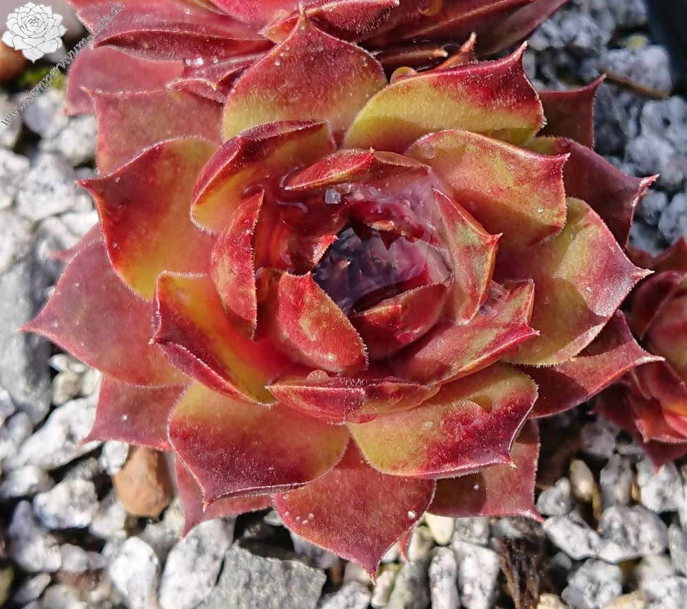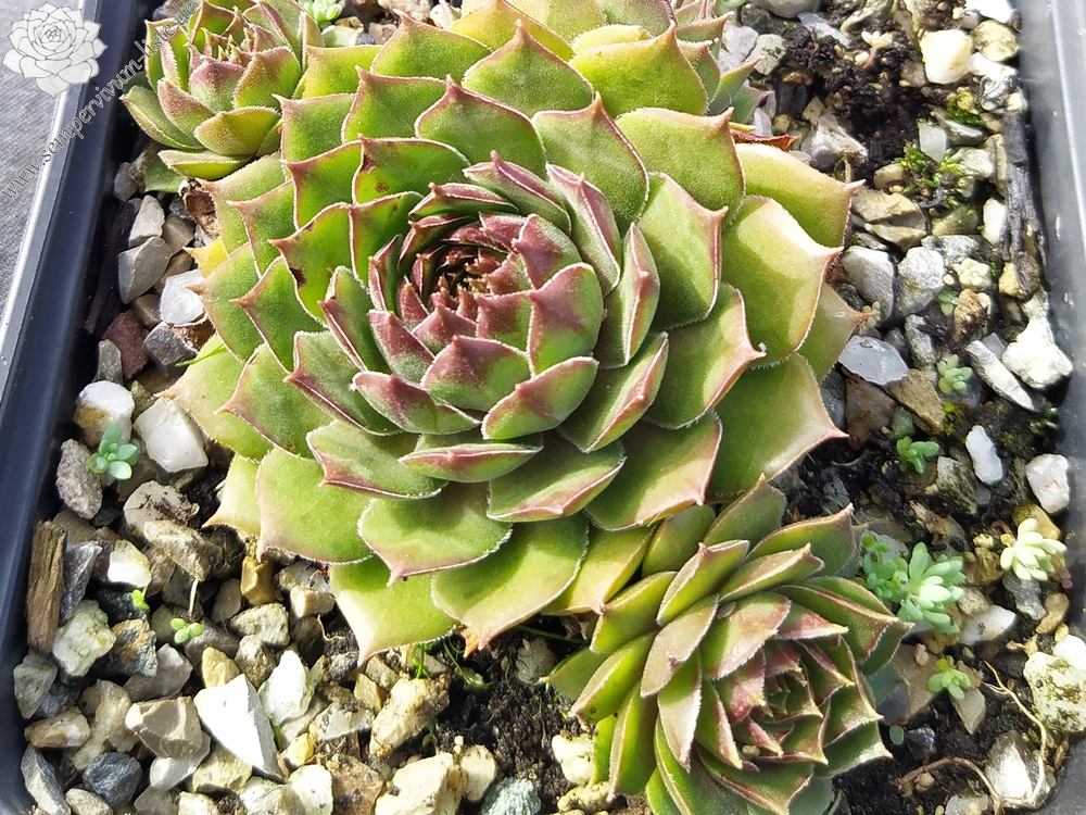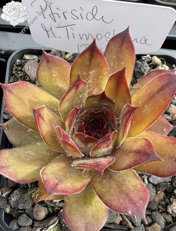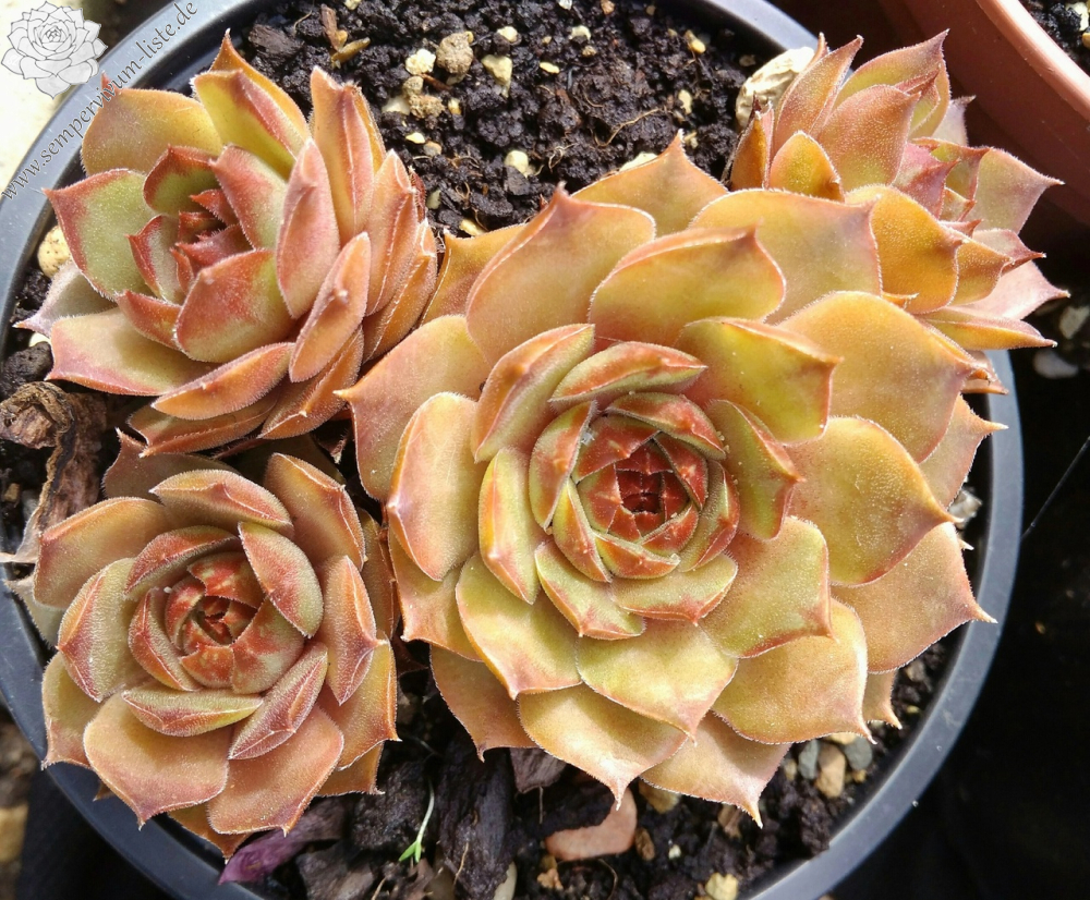 Mittelgroße Rosetten, behaart, mit einem Rand am Blattrand, erhalten im Sommer allmählich einen warmen pfirsichfarbenen Farbton. Die Eltern sind unbekannt.