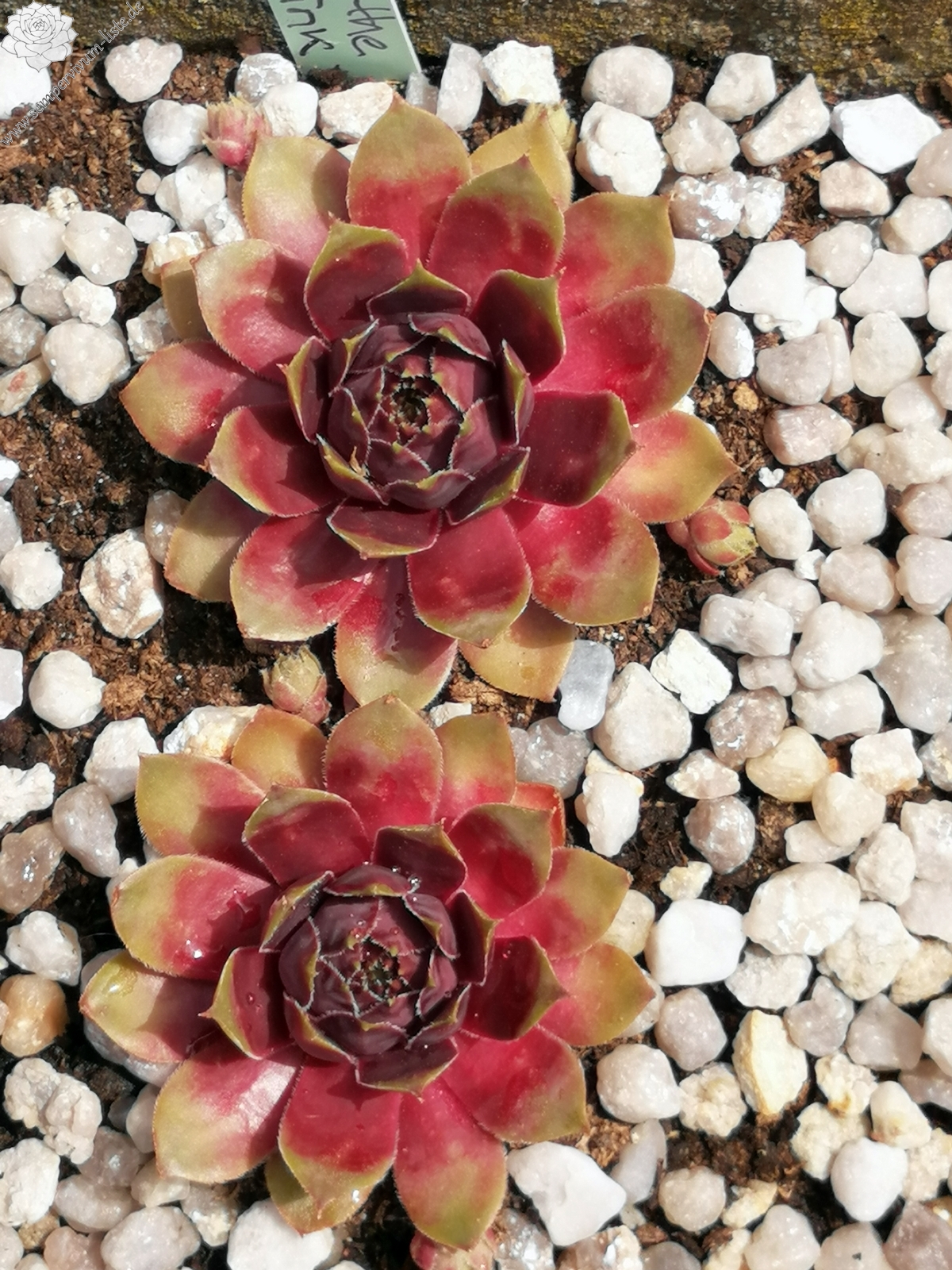 Sempervivum 'In the Pink' bildet schöne große Rosetten. Das Zentrum ist kräftig pink gefärbt und die Blattenden sind grünlich. Die breiten Blätter verleihen der Pflanze eine tolle Wirkung.