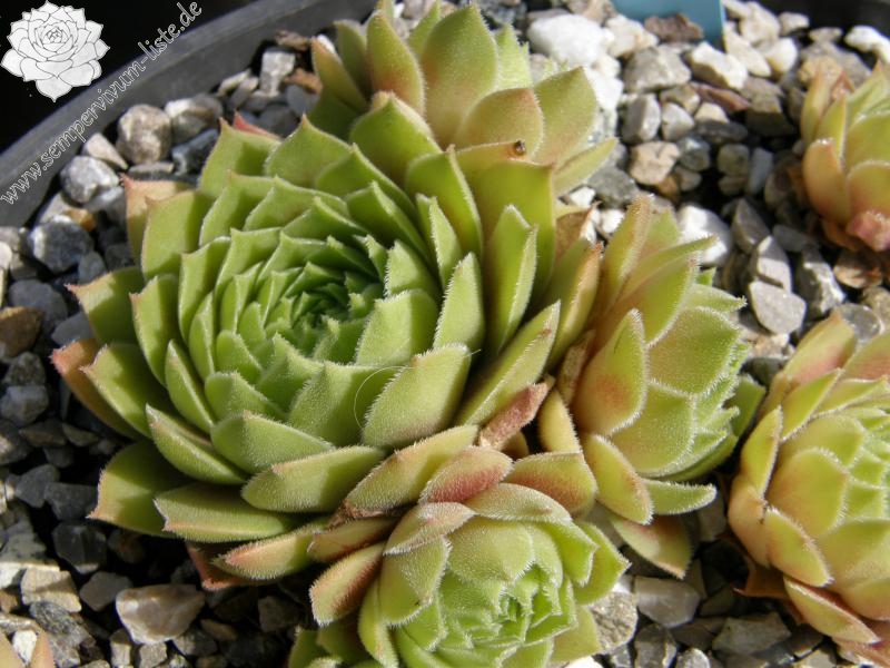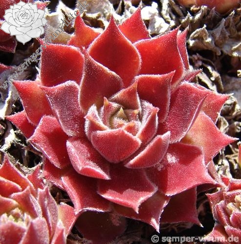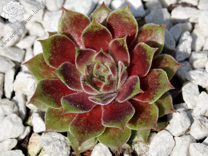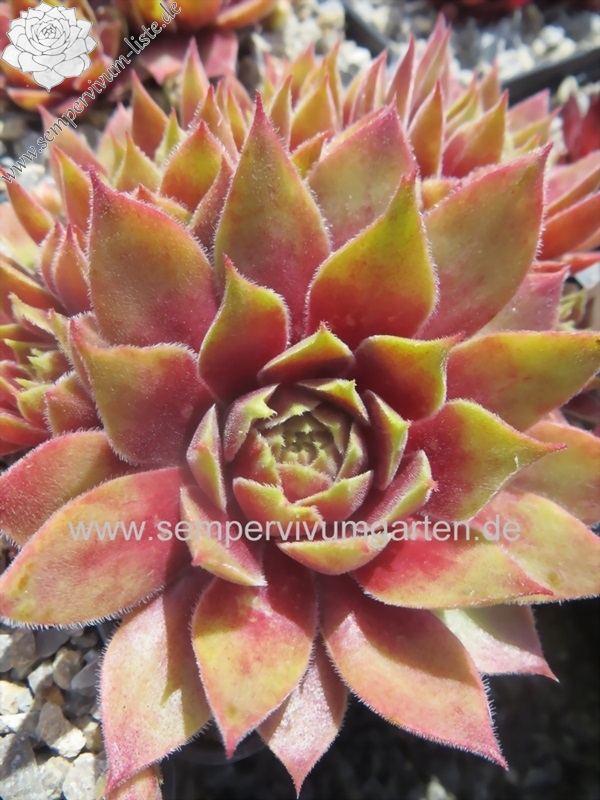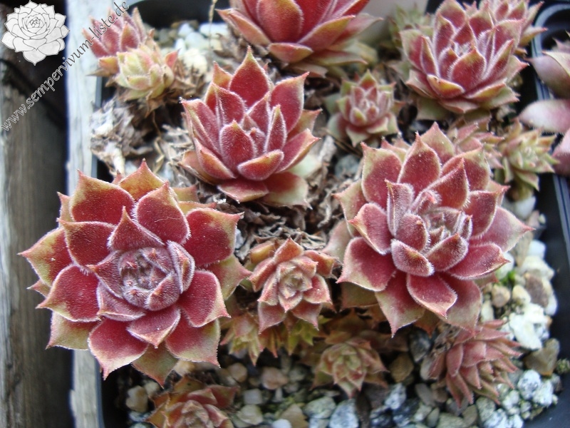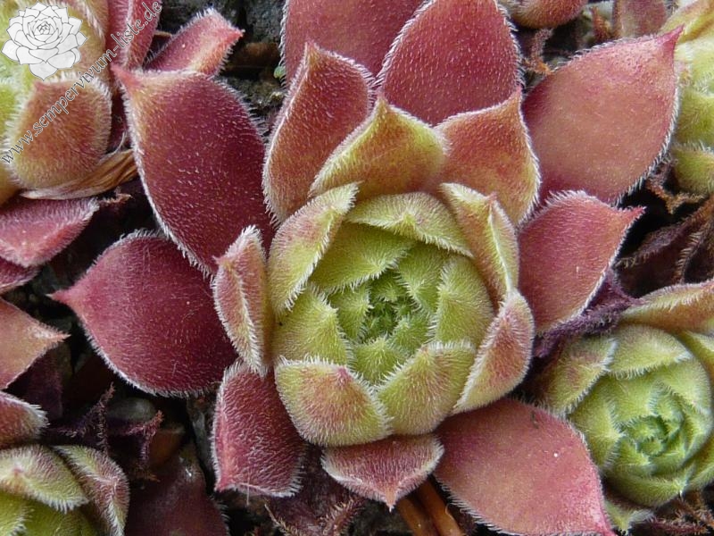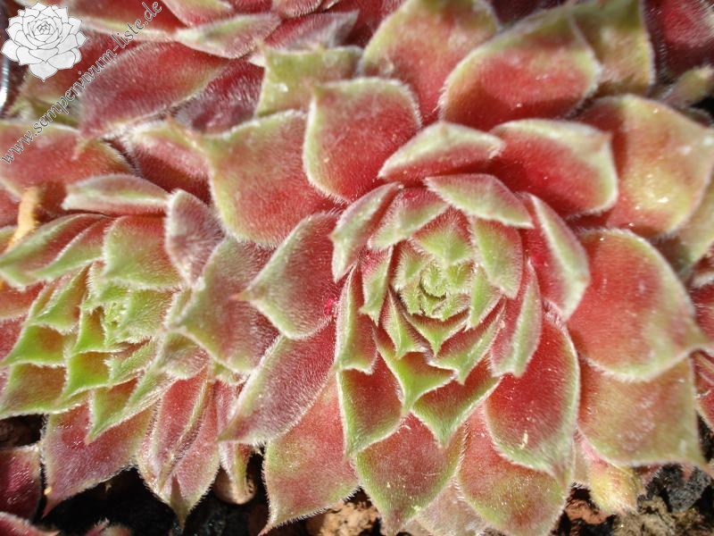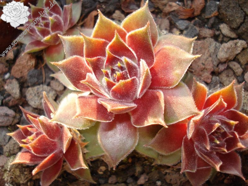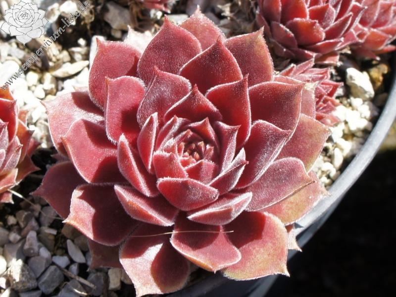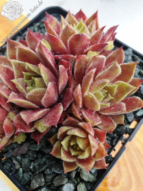 Samtene, mittelgroße Rosetten in auffallender Färbung von olivrosa bis zu himbeerroten Tönen. Die spitzen Blätter sind teilweise nach Ihnen gebogen.