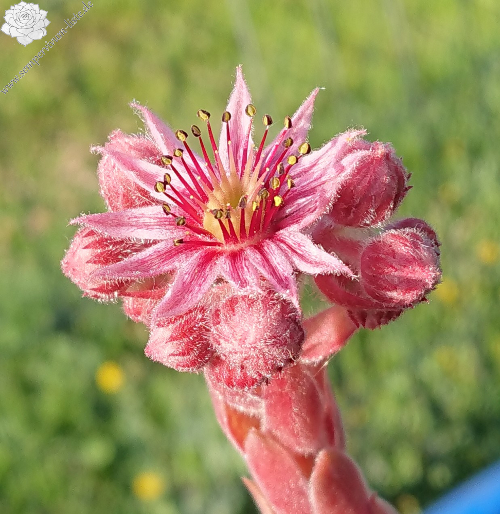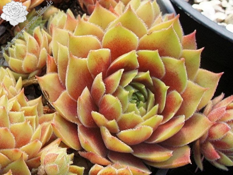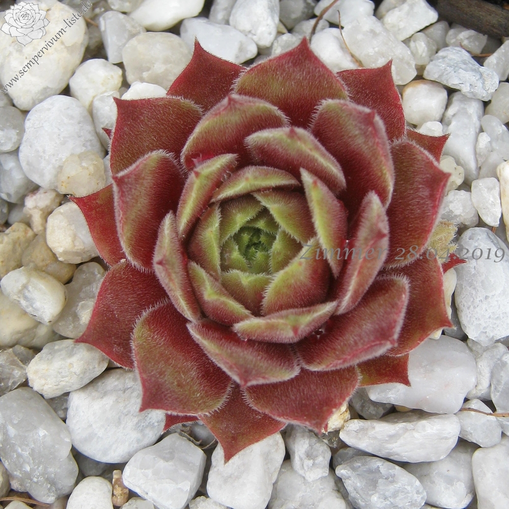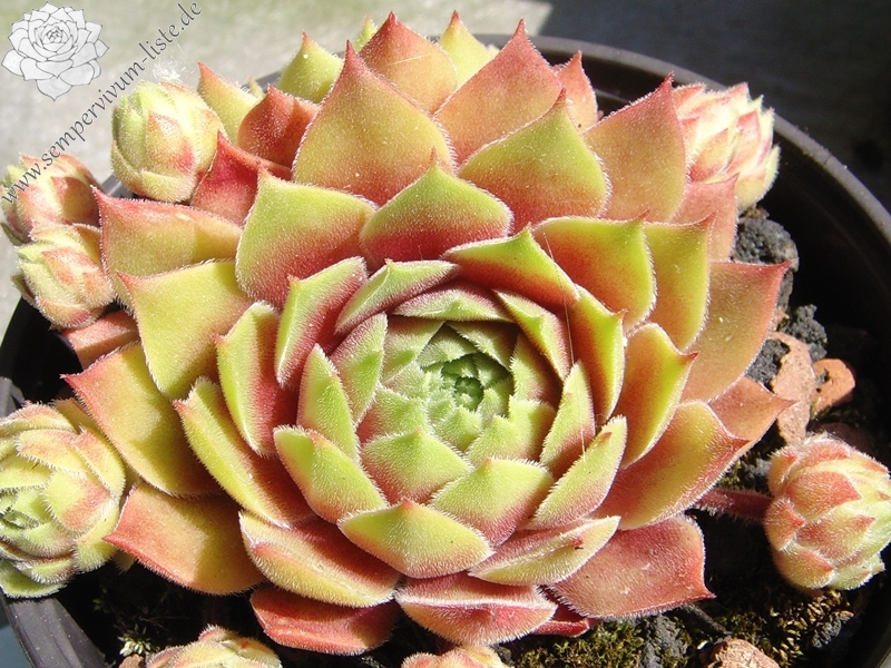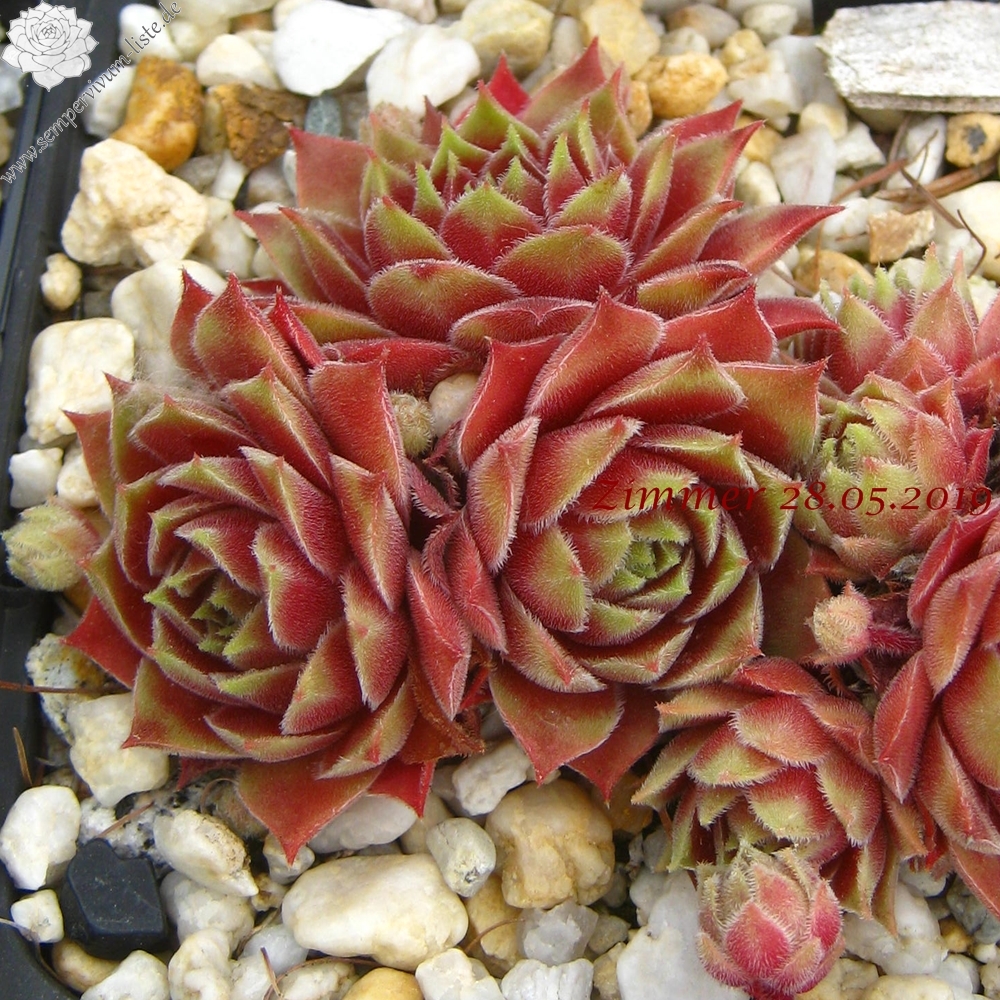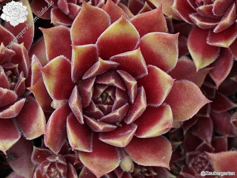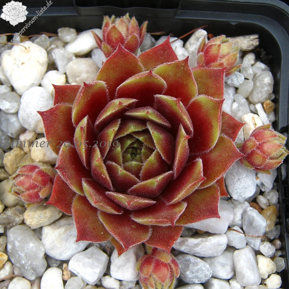 Samtene, mittelgroße Rosetten in auffallender Färbung von olivrosa bis zu himbeerroten Tönen. Die spitzen Blätter sind teilweise nach Ihnen gebogen.