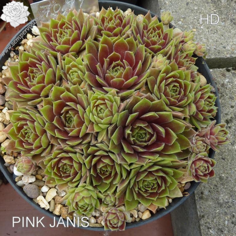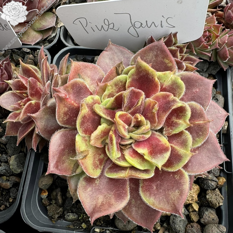 Die größeren Rosetten von 'Pink Janis' zeigen eine perfekte Form. Die ganze Pflanze macht einen samtigen Eindruck. Besonders auffallend ist das rote Zentrum, das sich sehr gut von der kühlen Grundfärbung abhebt.