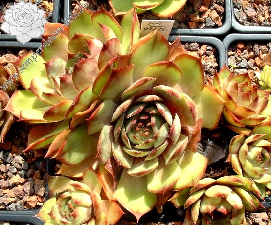 bis 6 cm große offene Rosetten, gelblich grün, Ränder und Spitzen orangebraun, wüchsig, ein Elternteil 'Seneca'