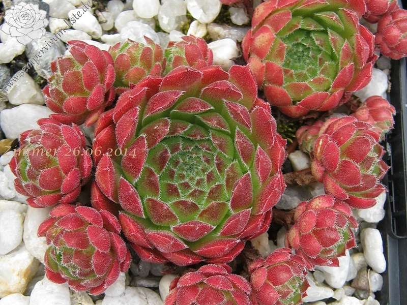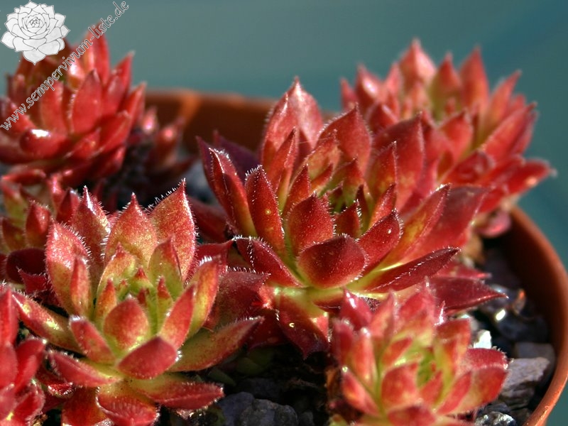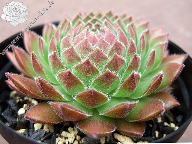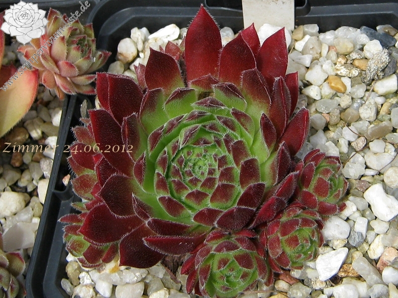 mittelgroße Rosetten, innen grün, außen dunkelrot, stark behaart und von sehr roter Wirkung, Blüte rosarot, 20 cm